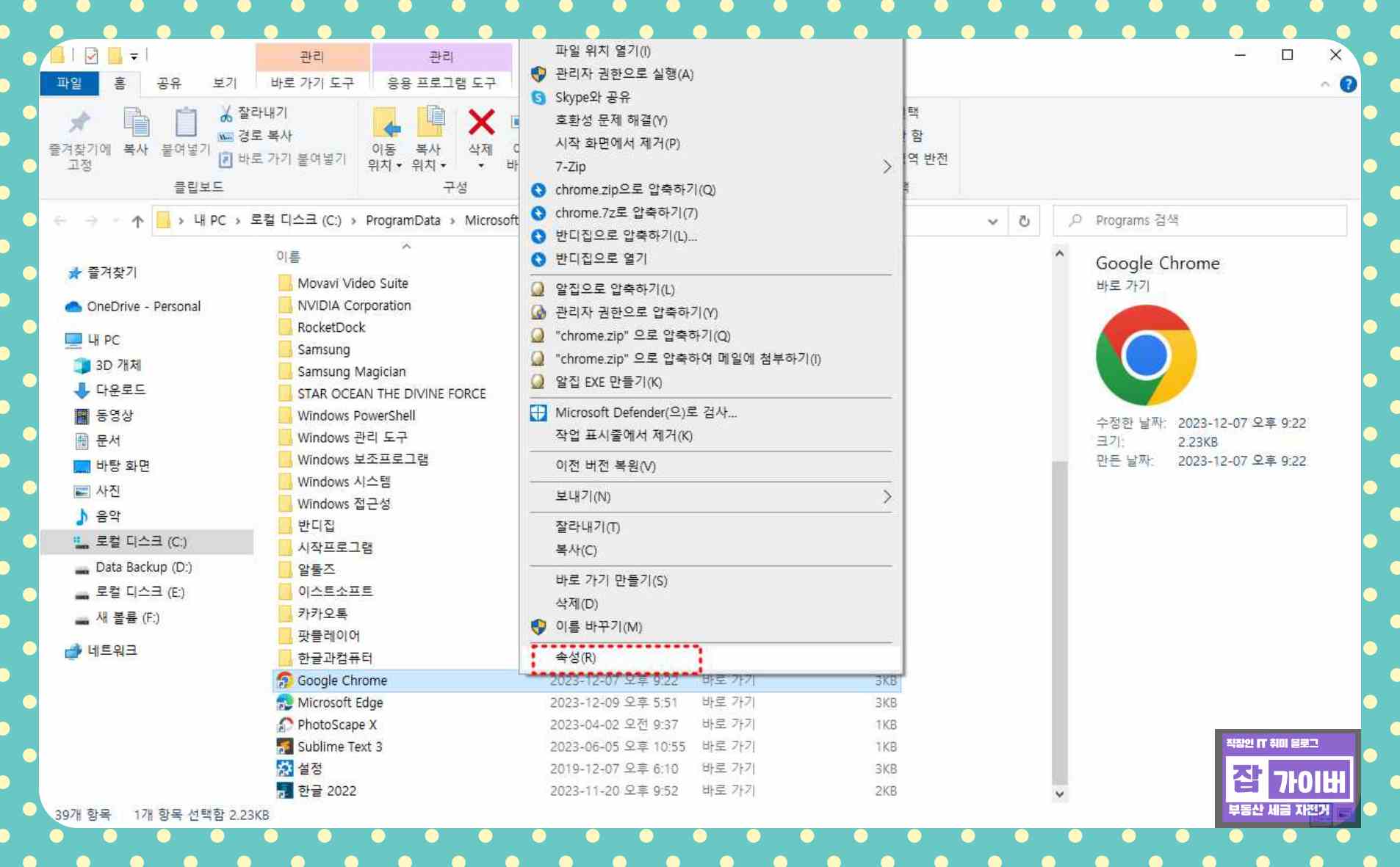 여기에서 Google Chrome 바로가기 아이콘을 다시 오른쪽 버튼으로 클릭하고, 속성 메뉴를 엽니다.