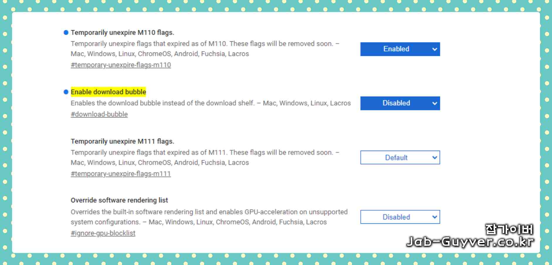 크롬 버전에 따라서는 Enable download bubble 항목이 이미 제거된 경우가 많습니다.