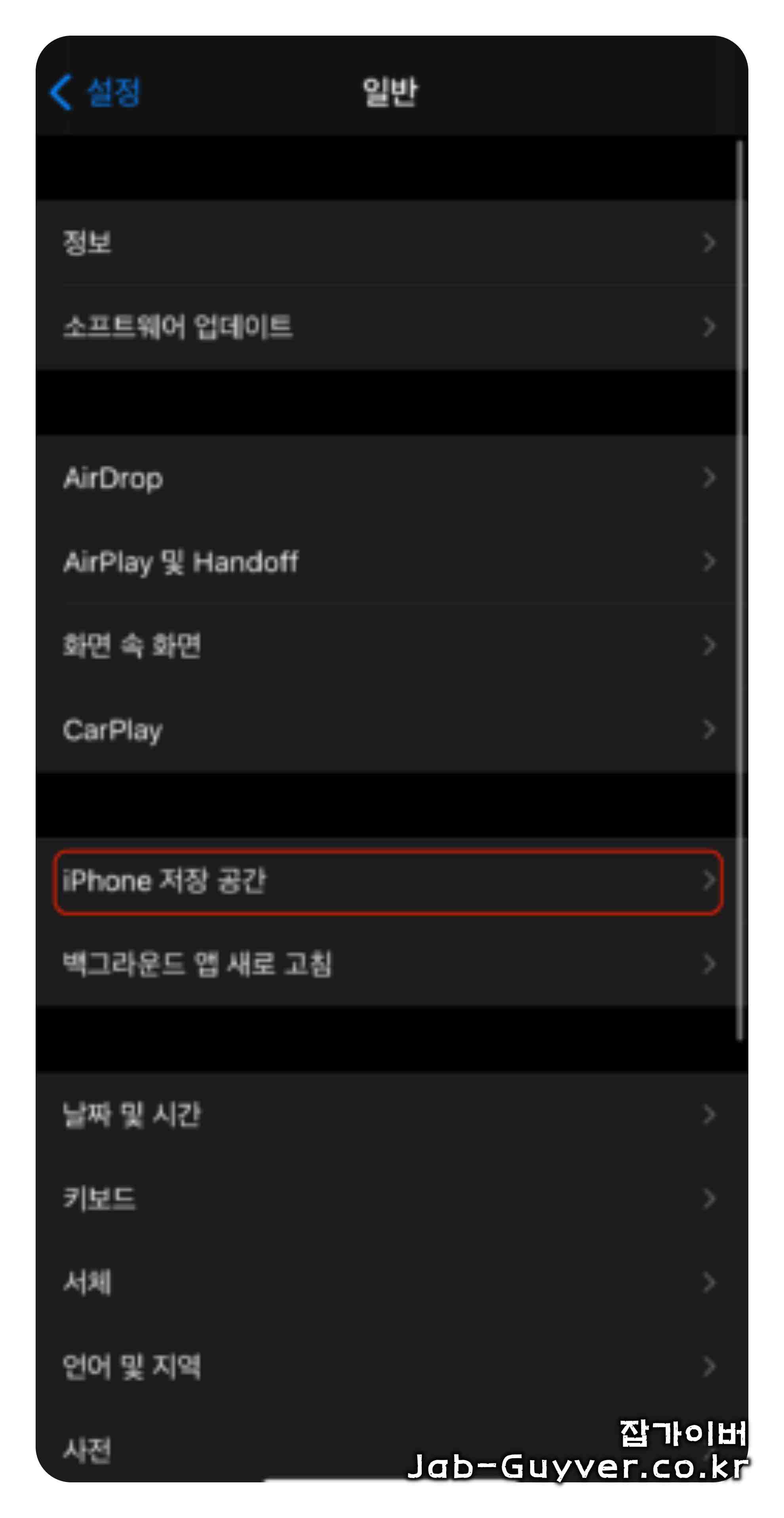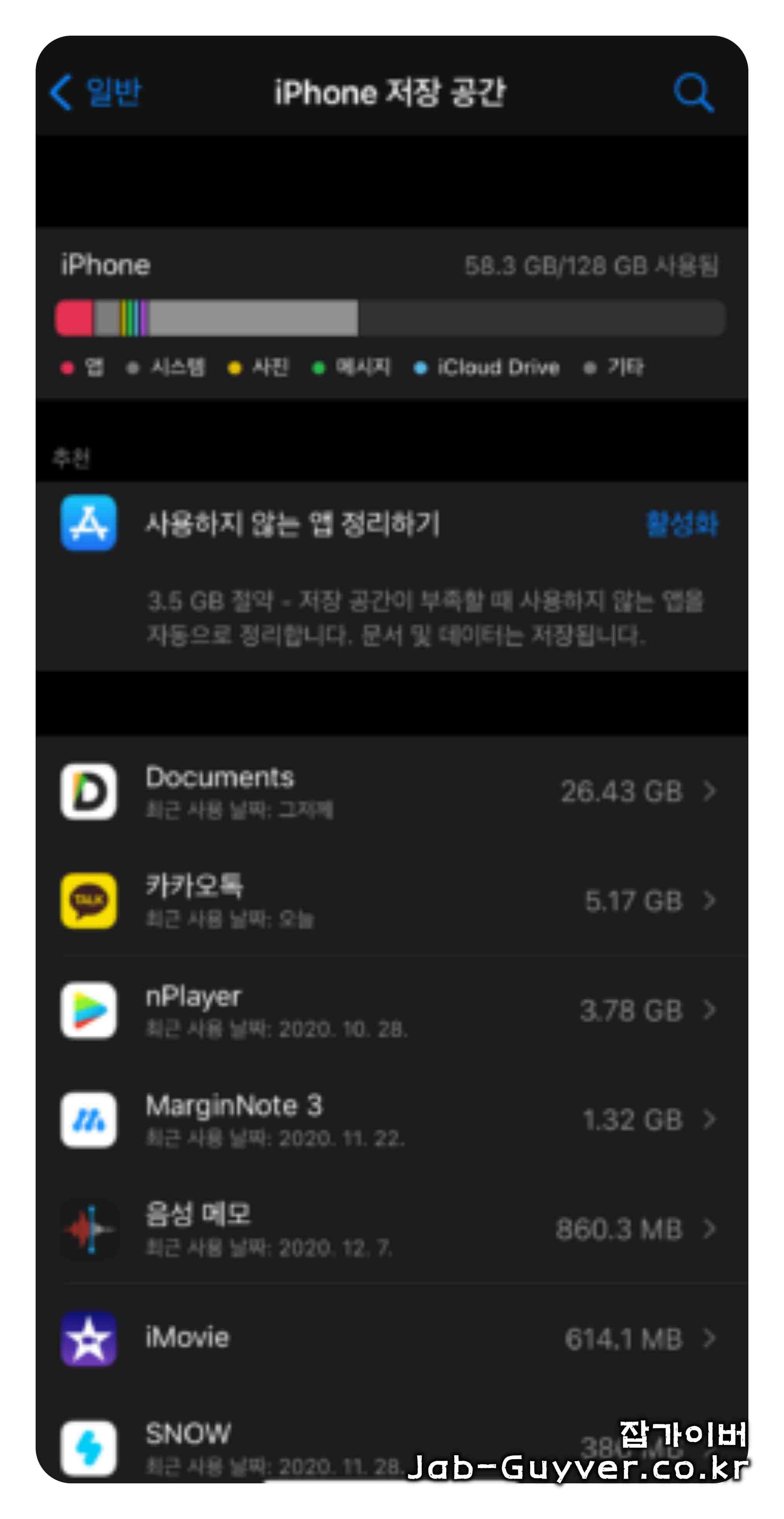 - iPhone 저장 공간에서 앱별 차지 용량 확인 가능
