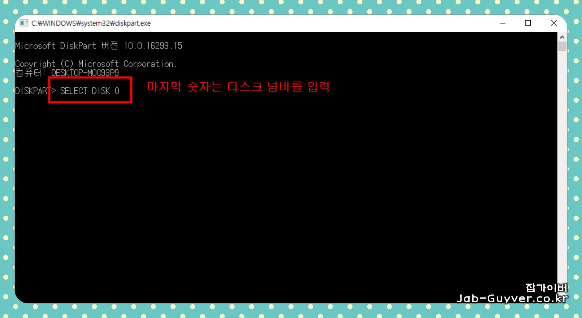 "SELECT DISK" 명령어를 사용하여 작업할 디스크 (USB 메모리)를 선택합니다. 순서는 컴퓨터마다 다를 수 있으므로 정확한 크기를 확인해야 합니다.