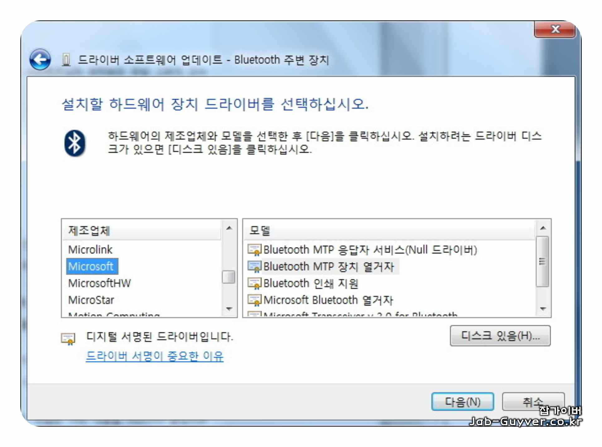 “Bluetooth 송수신 장치“를 선택하고 “다음” 버튼을 클릭 후 좌측에서 “Microsoft”를 선택합니다. 오른쪽 창에서 “Bluetooth MTP 장치 열거자“를 선택하고 “다음” 버튼을 클릭합니다.