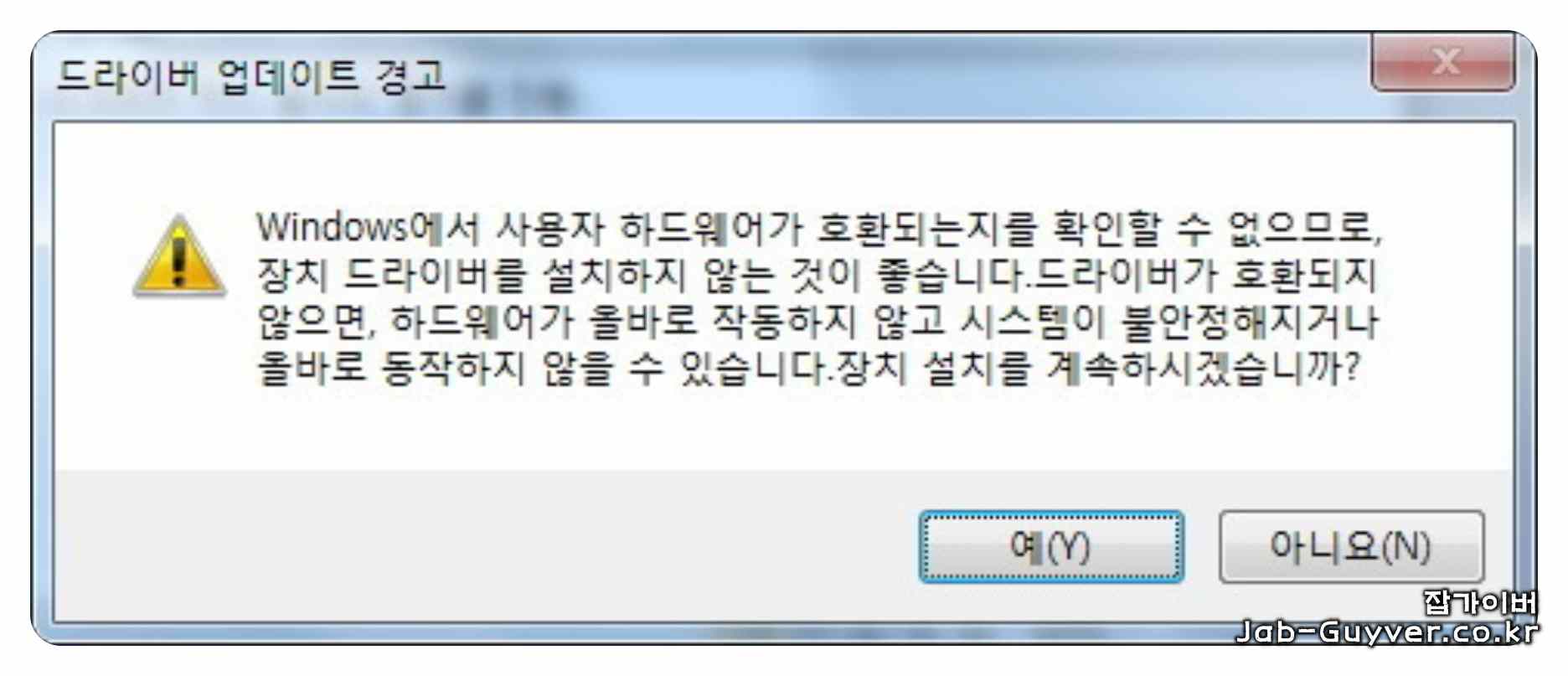 드라이버 설치 전에 경고창이 나타날 수 있습니다. “예(Y)” 버튼을 클릭하여 계속 진행합니다.