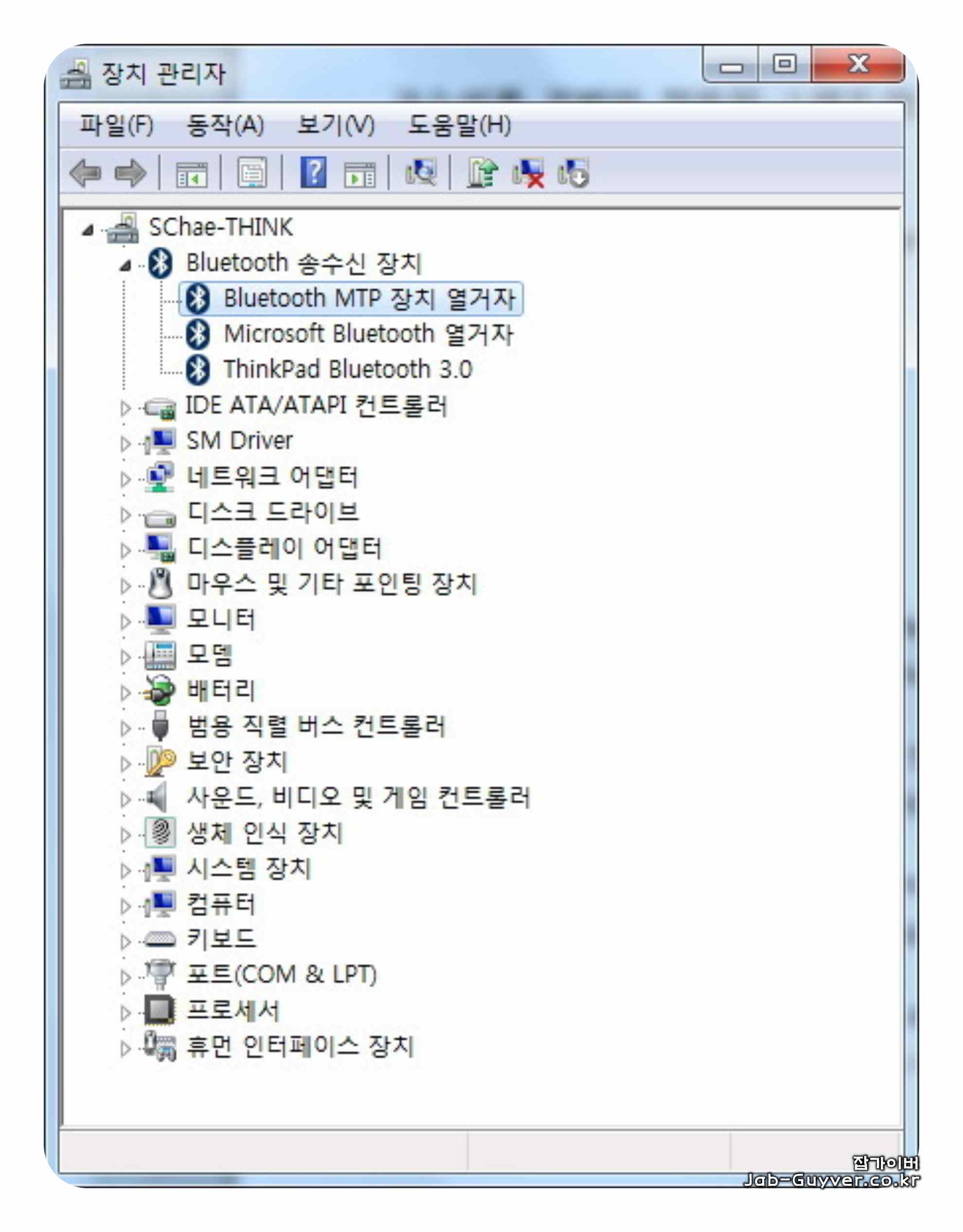 이때 의외로 효과가 큰 게 Bluetooth MTP 장치 열거자(Bluetooth MTP Enumerator) 드라이버를 정상 상태로 맞춰주는 방법입니다.