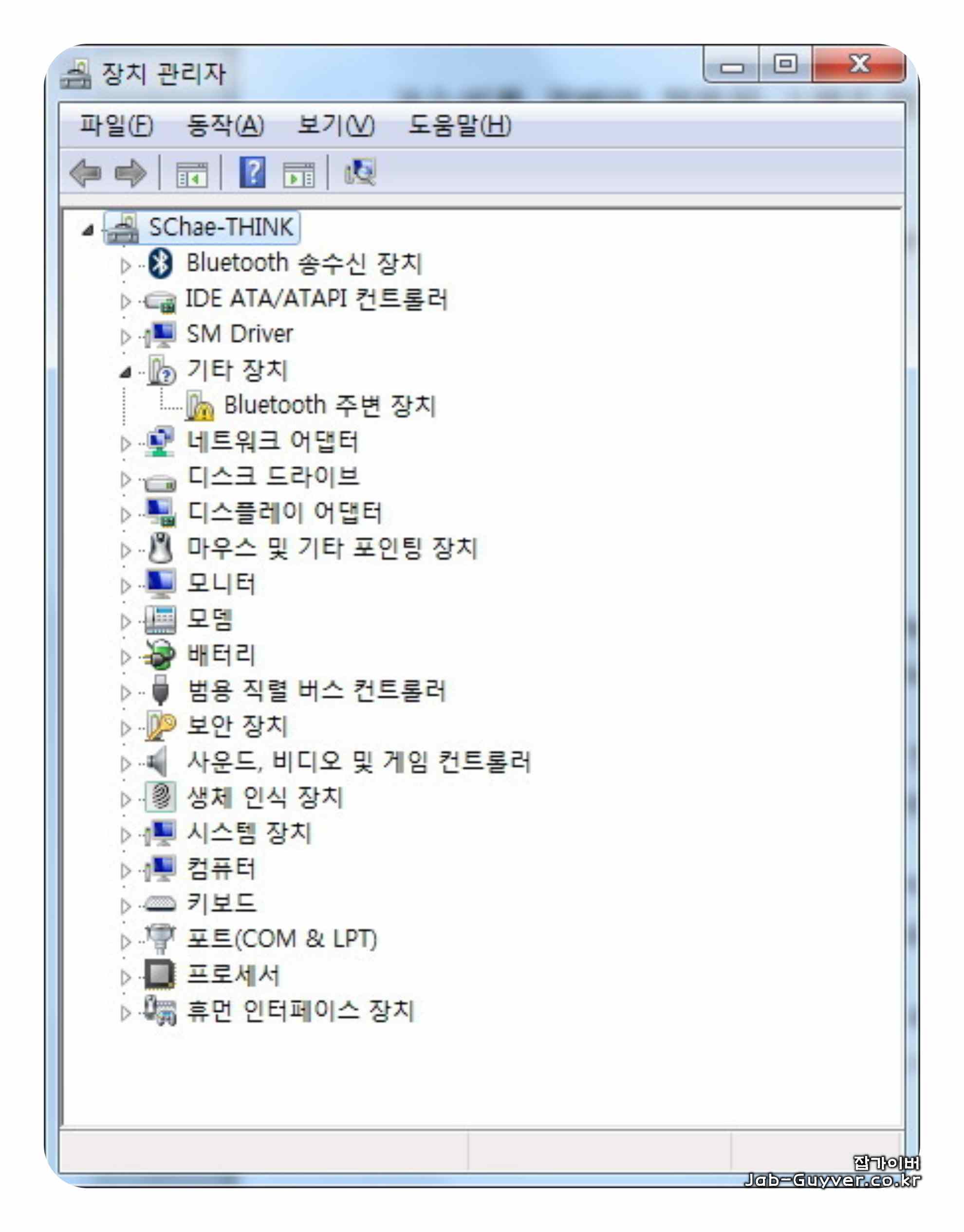 - Bluetooth 주변장치가 느낌표와 함께 뜨고 드라이버가 자동 설치되지 않음