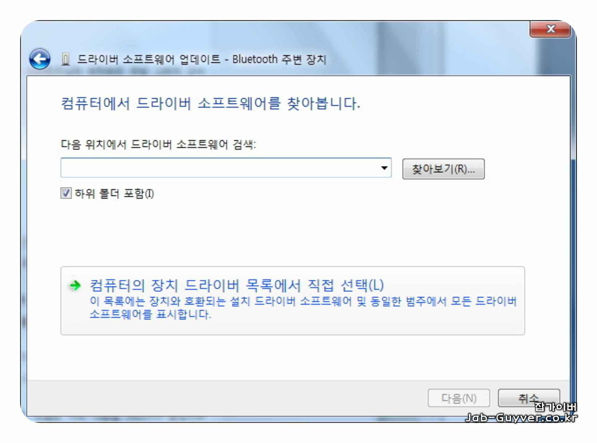 업데이트 창에서 “컴퓨터에서 드라이버 소프트웨어 찾아보기“를 선택 후 블루투스 주변 장치 드라이버 소프트웨어 업데이트 검색에서 “컴퓨터의 장치 드라이버 목록에서 직접 선택”을 선택합니다.