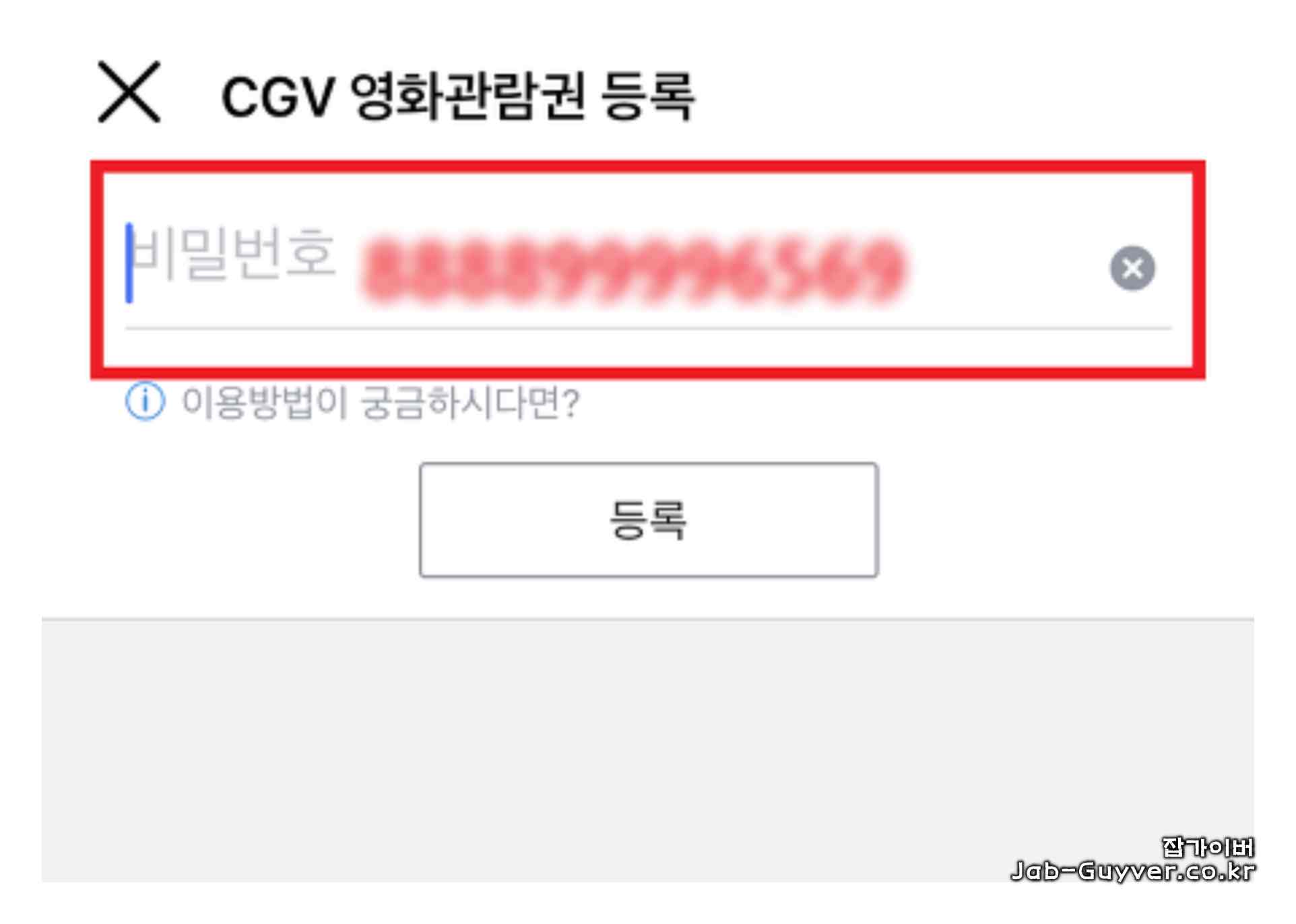 CGV 앱 로그인 후 MY CGV에서 관람권/카드로 들어가 CGV 영화관람권을 선택하고 스크래치 번호를 입력하면 됩니다.