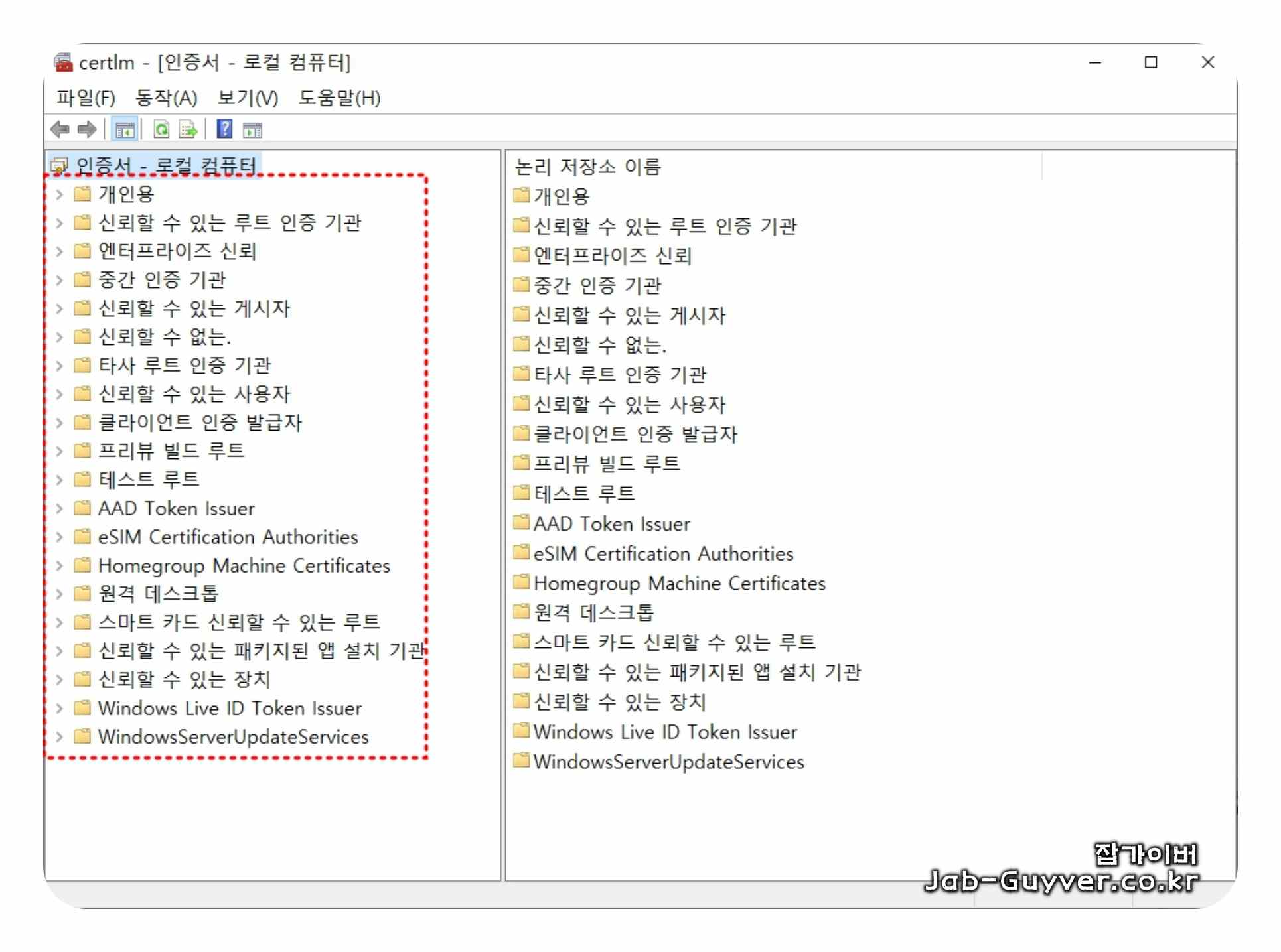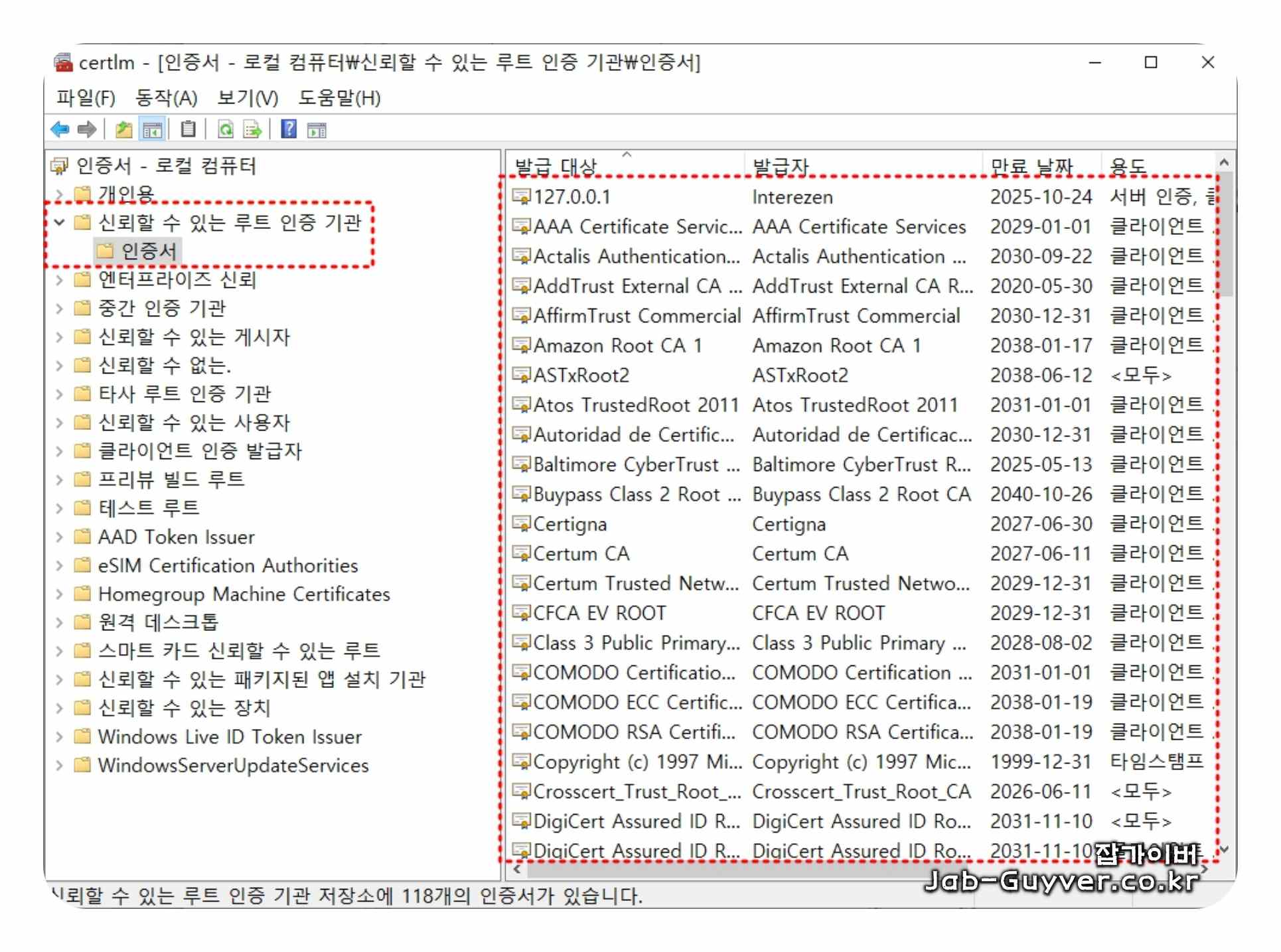 인증서 관리 창의 왼쪽 트리에서 신뢰할 수 있는 루트 인증 기관을 더블 클릭해 펼쳐줍니다. 이 영역은 말 그대로 윈도우가 최상위로 신뢰하는 인증서 목록이 들어가는 공간입니다.