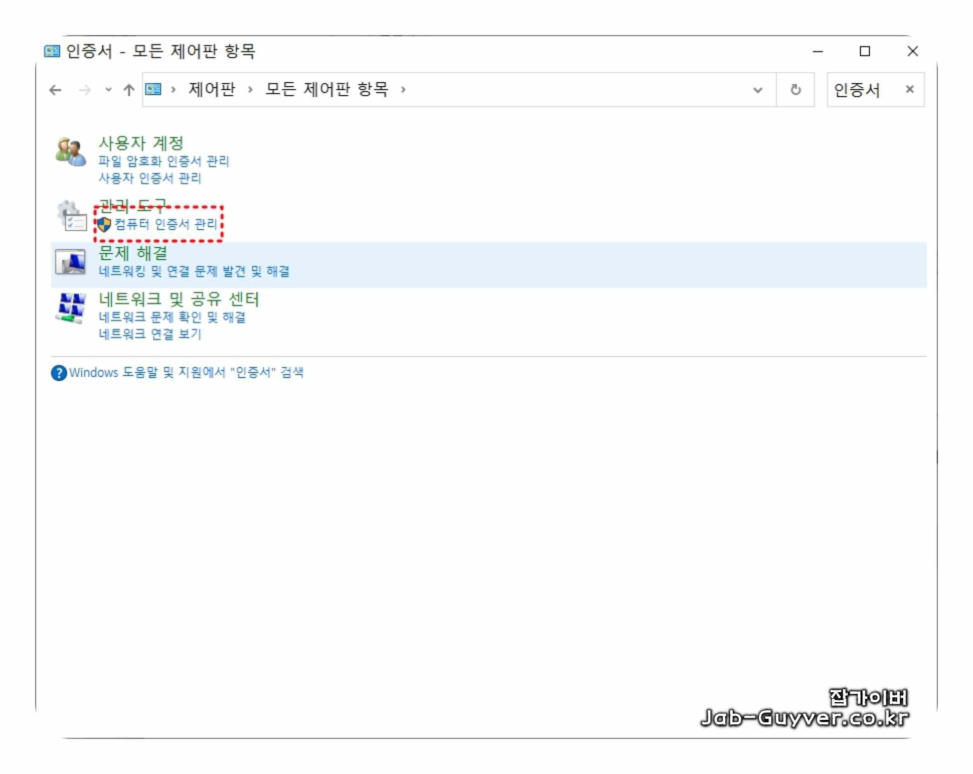 제어판 창이 열리면 우측 상단 검색칸에 인증서라고 입력합니다. 그러면 항목 중에 컴퓨터 인증서 관리가 노출되는데, 이 메뉴를 클릭하면 앞에서 certlm.msc로 들어왔던 것과 동일한 관리 화면으로 연결됩니다.