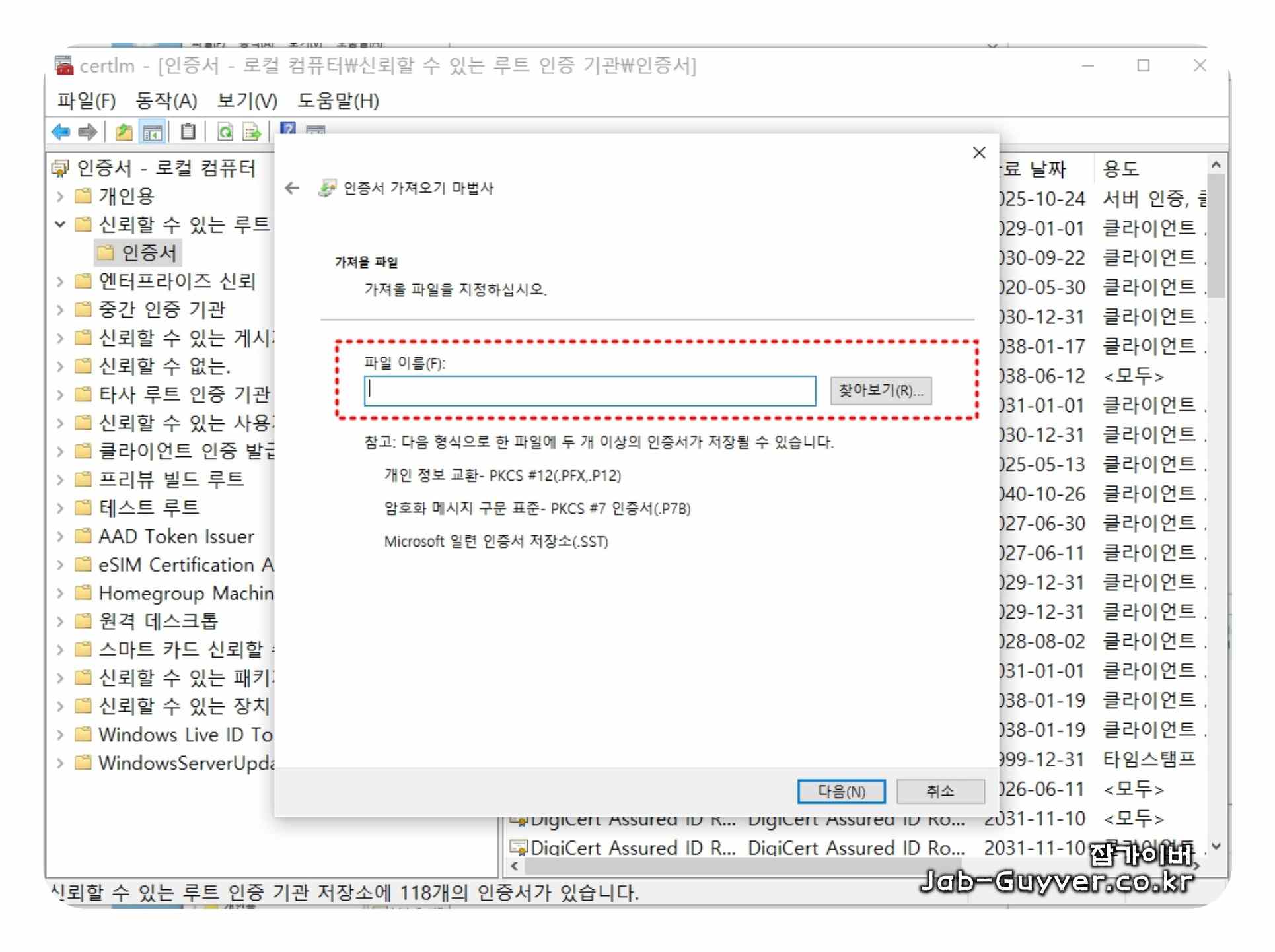 윈도우11 신뢰할 수 있는 루트 인증 기관에서 인증서 가져오기