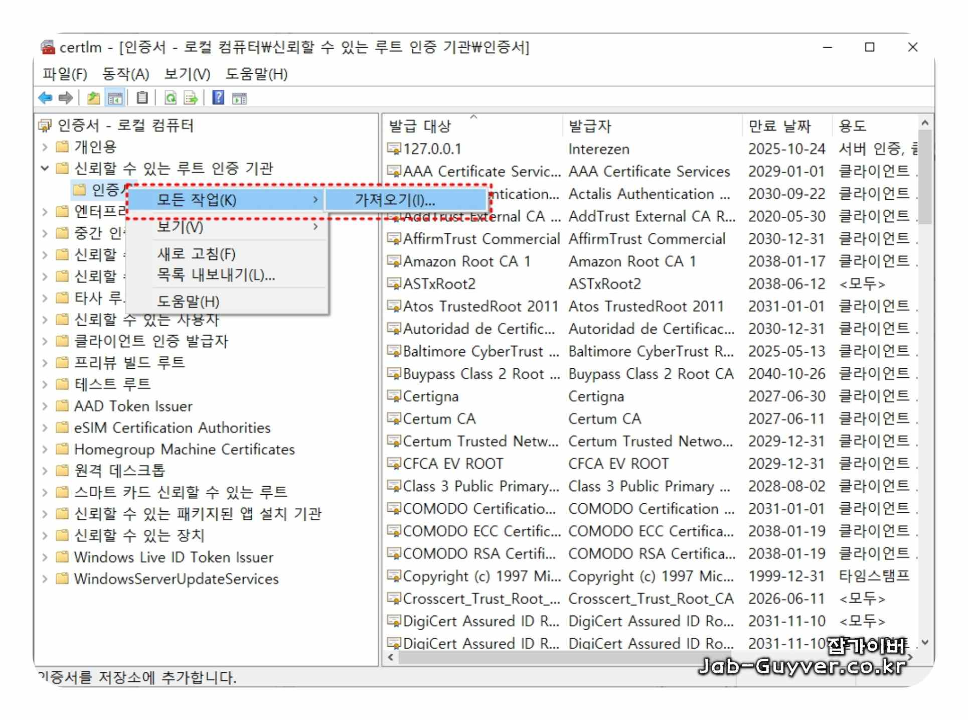 여기서 추가로 넣고 싶은 인증서가 있다면 목록의 빈 공간이나 원하는 인증서를 우클릭한 뒤 모든 작업 > 가져오기를 선택합니다. 그러면 인증서 가져오기 마법사 창이 새로 열립니다.