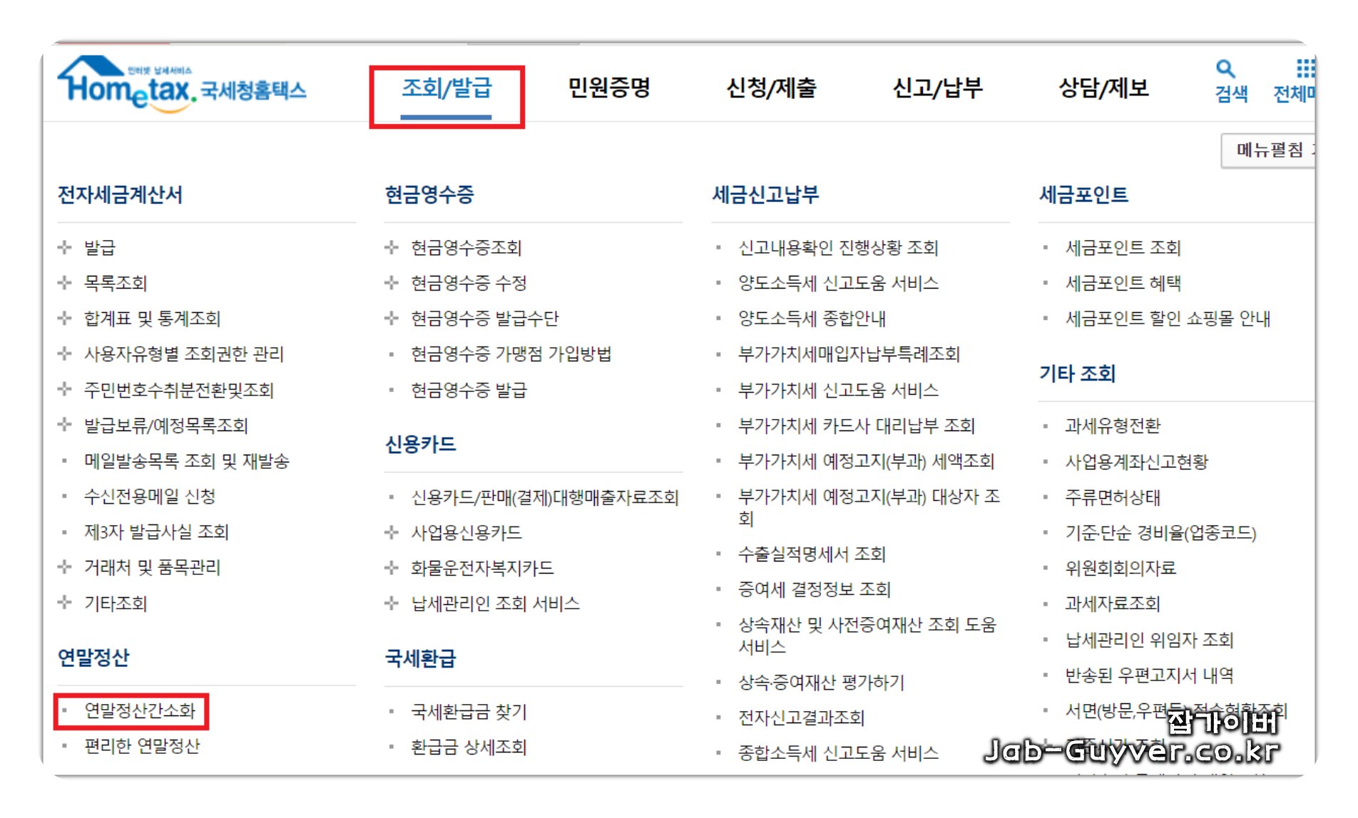 상단 메뉴에서 연말정산 관련 서비스를 찾습니다.