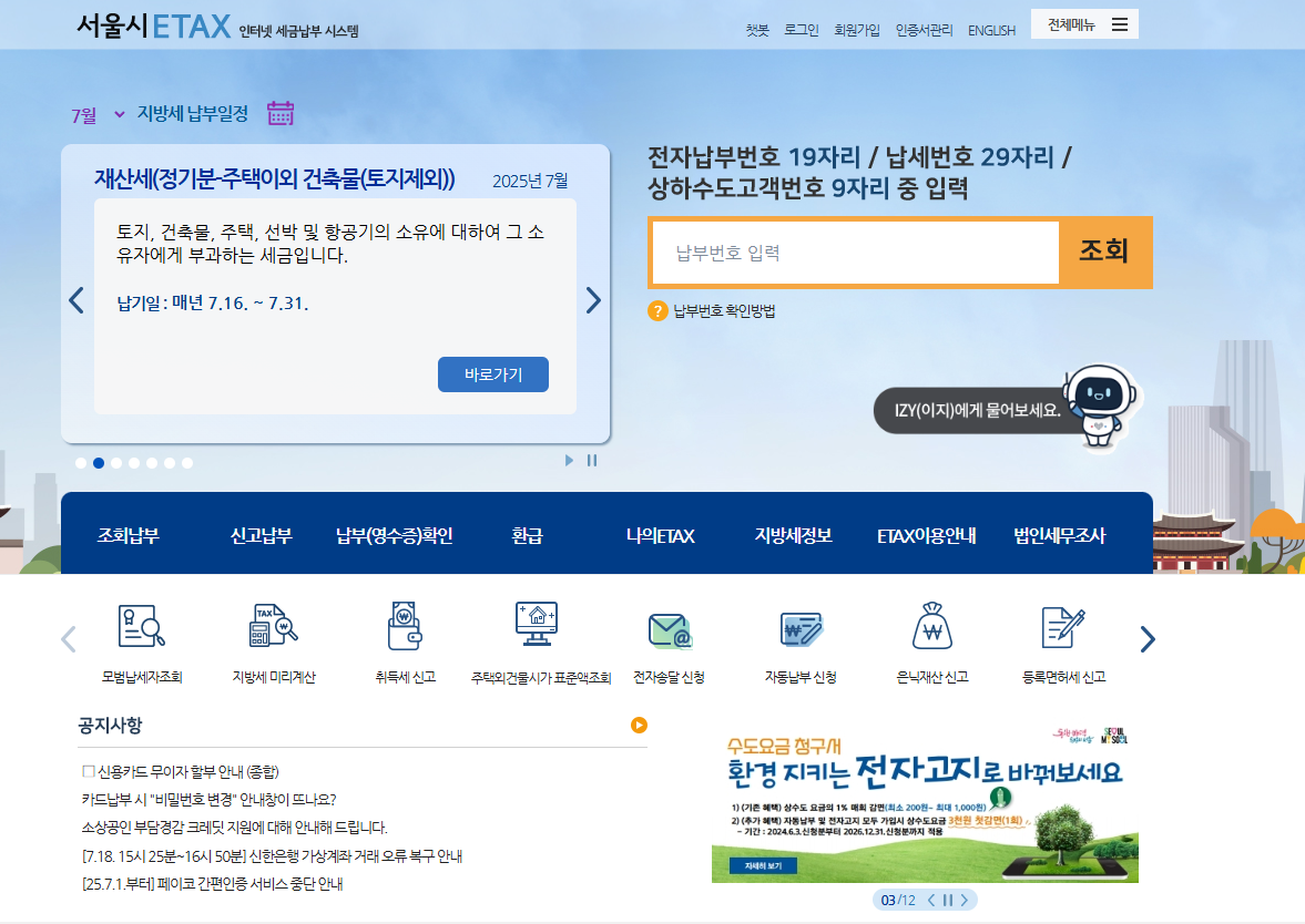 ⇒ etax.seoul.go.kr 접속 → 비회원납부선택 → 고지서의 적색부분에 있는 “기관번호~과세번호” 숫자 입력 → 계좌이체 또는 카드납부