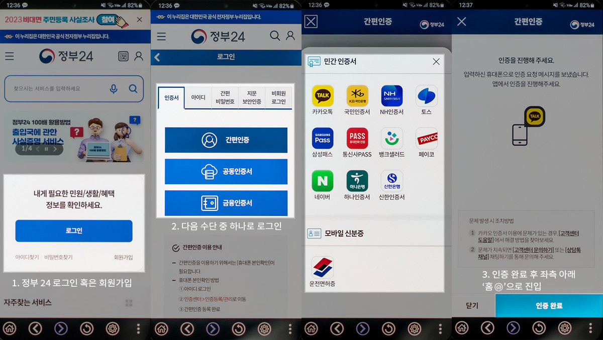 최근에는 모바일 인증 절차가 강화되어 정부24 앱 내에서도 본인확인 수단으로 패스(PASS) 인증과 간편 비밀번호를 지원한다.