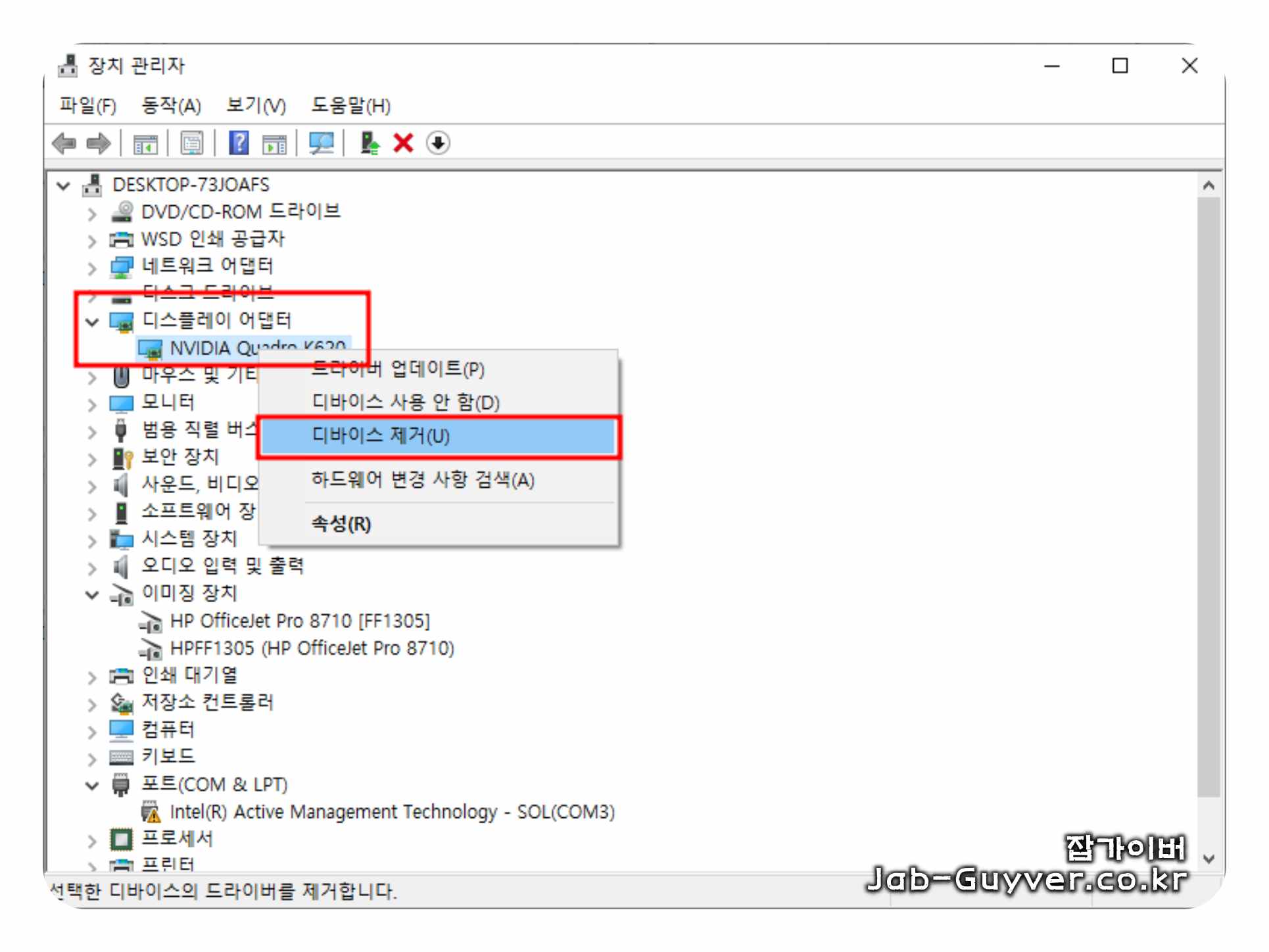 가벼운 꼬임이면 장치 관리자 제거만으로 해결되기도 합니다. 다만 교체 직후부터 계속 문제라면, 잔여 구성요소까지 정리하는 DDU 쪽이 성공 확률이 높은 편입니다.