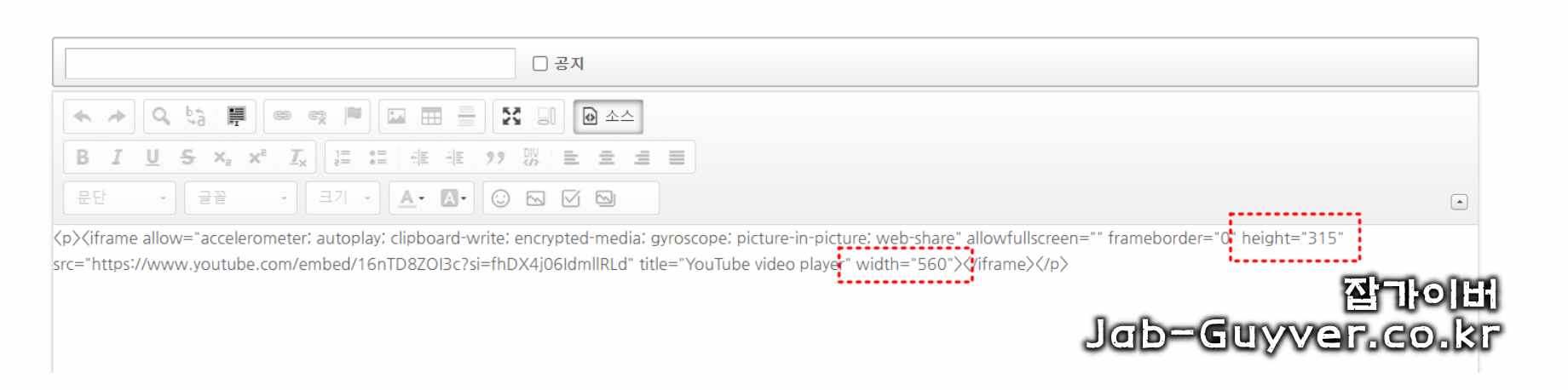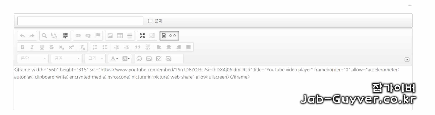 이렇게 업로드하고자 하는 동영상의 HTML 주소를 확인했다면 게시판에 업로드 시 HTML 소스아이콘을 선택합니다.