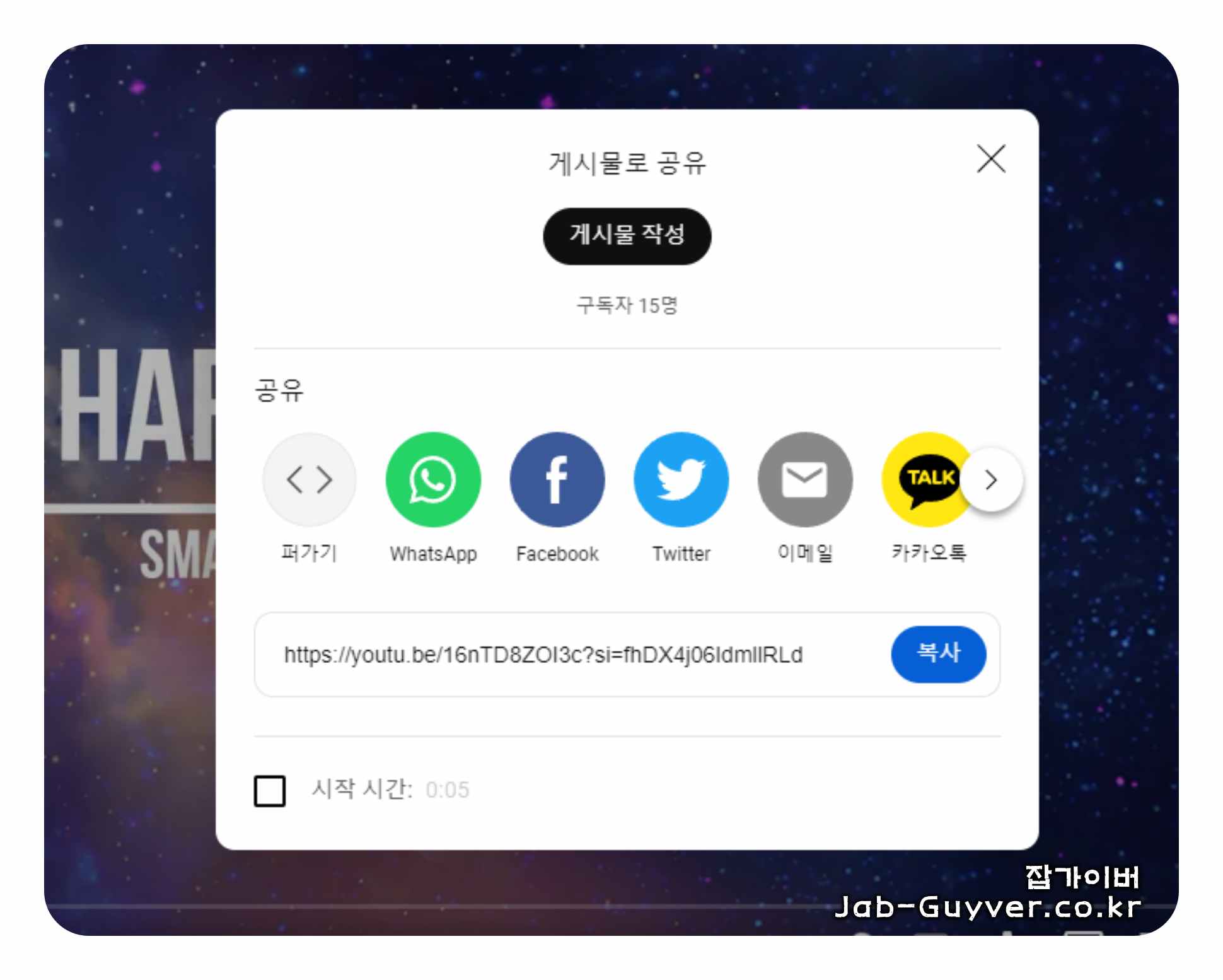 유튜브에서 원하는 동영상을 선택한 후, '공유' 버튼을 클릭하면 '퍼가기' 옵션이 보입니다.