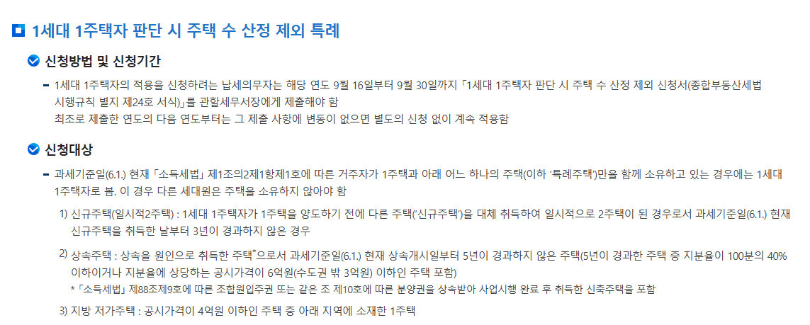 | 일시적 2주택 | 1세대 1주택자가 새로운 주택을 취득하고, 일정 기간 안에 기존 주택을 처분하는 경우 | 요건을 충족하면 과세기준일에 2주택이어도 종부세 주택 수에서 제외 가능. |