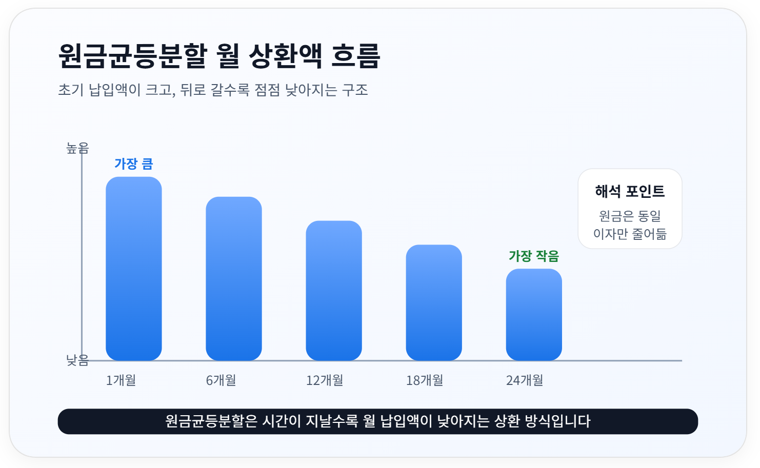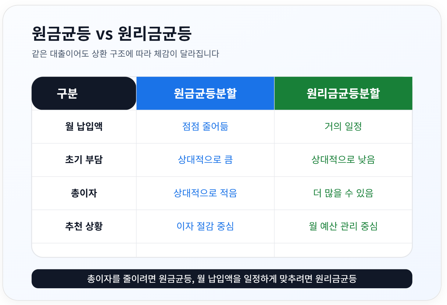 둘 다 매달 나누어 갚는 방식이지만, 실제 상환 구조는 꽤 다릅니다.