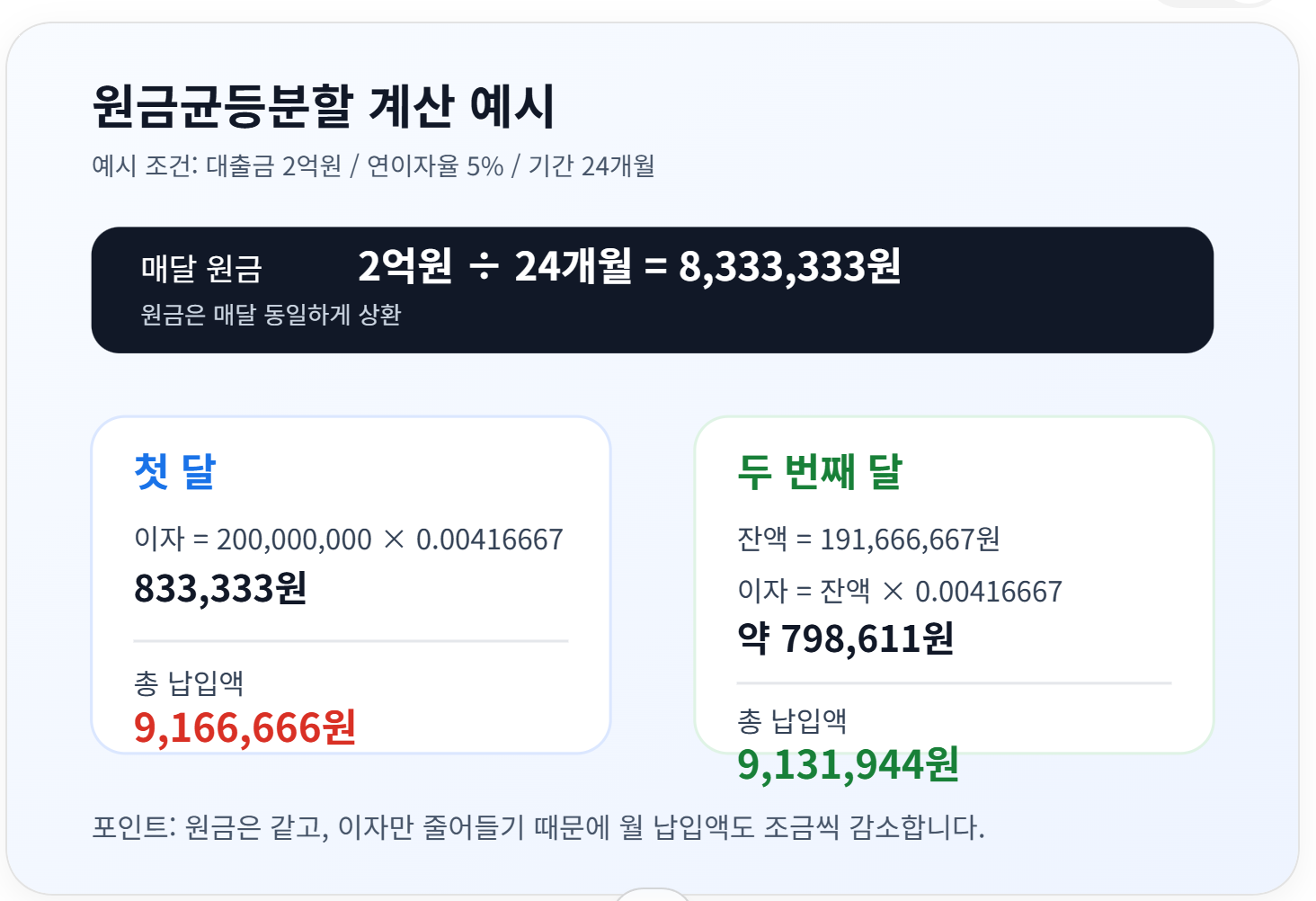 2억원을 24개월로 나누면 매달 갚는 원금이 계산됩니다.