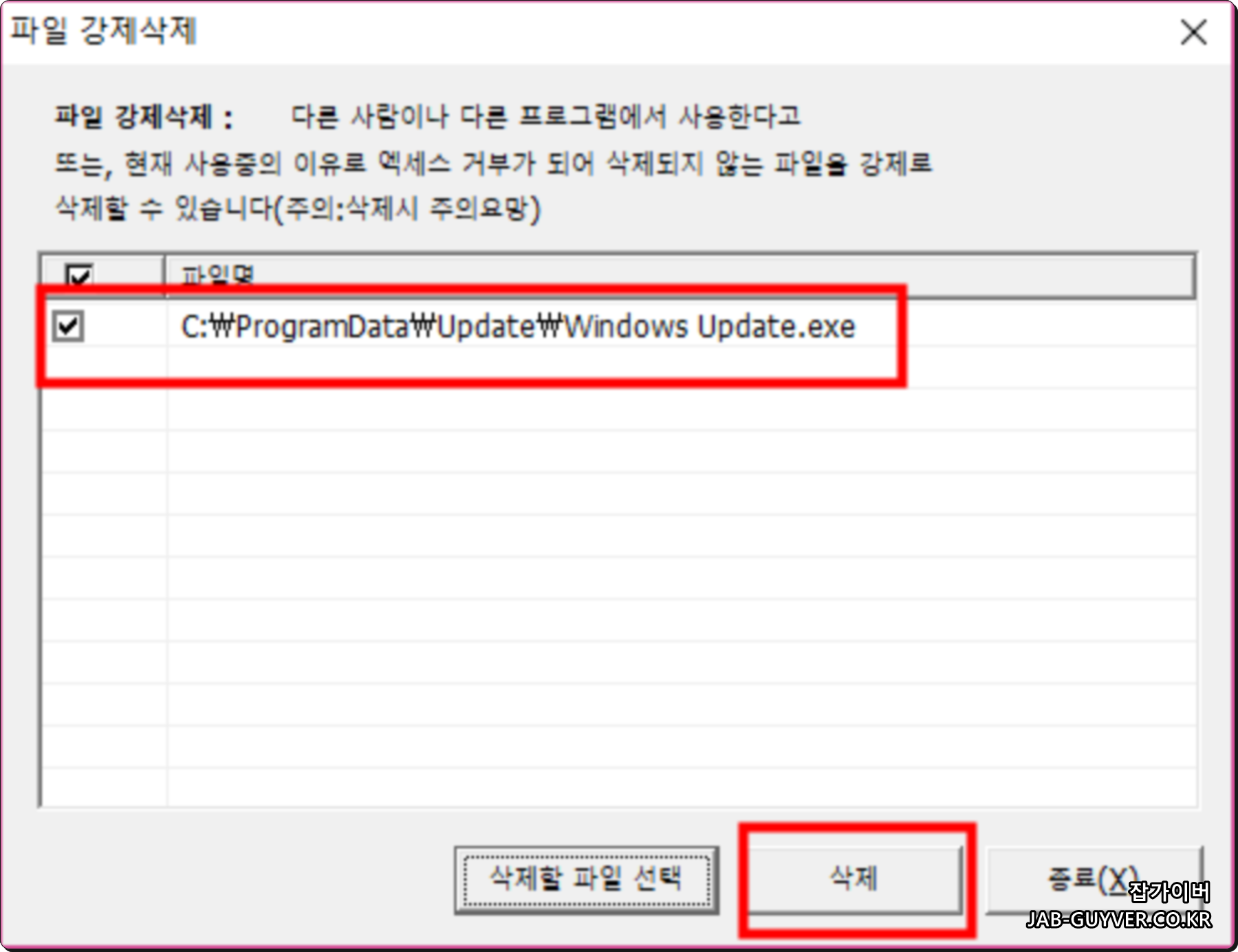 그러면 파일강제삭제에 이렇게 파일이 추가되며 파일명 앞에 체크를 해준 다음 삭제 버튼을 클릭하자