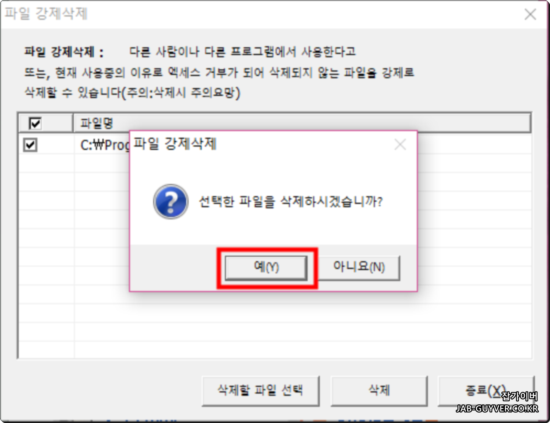정말 파일을 삭제할 것인지 묻는데 삭제 버튼을 눌러주면 지워지지 않던 파일이 강제로 삭제 완료된다.