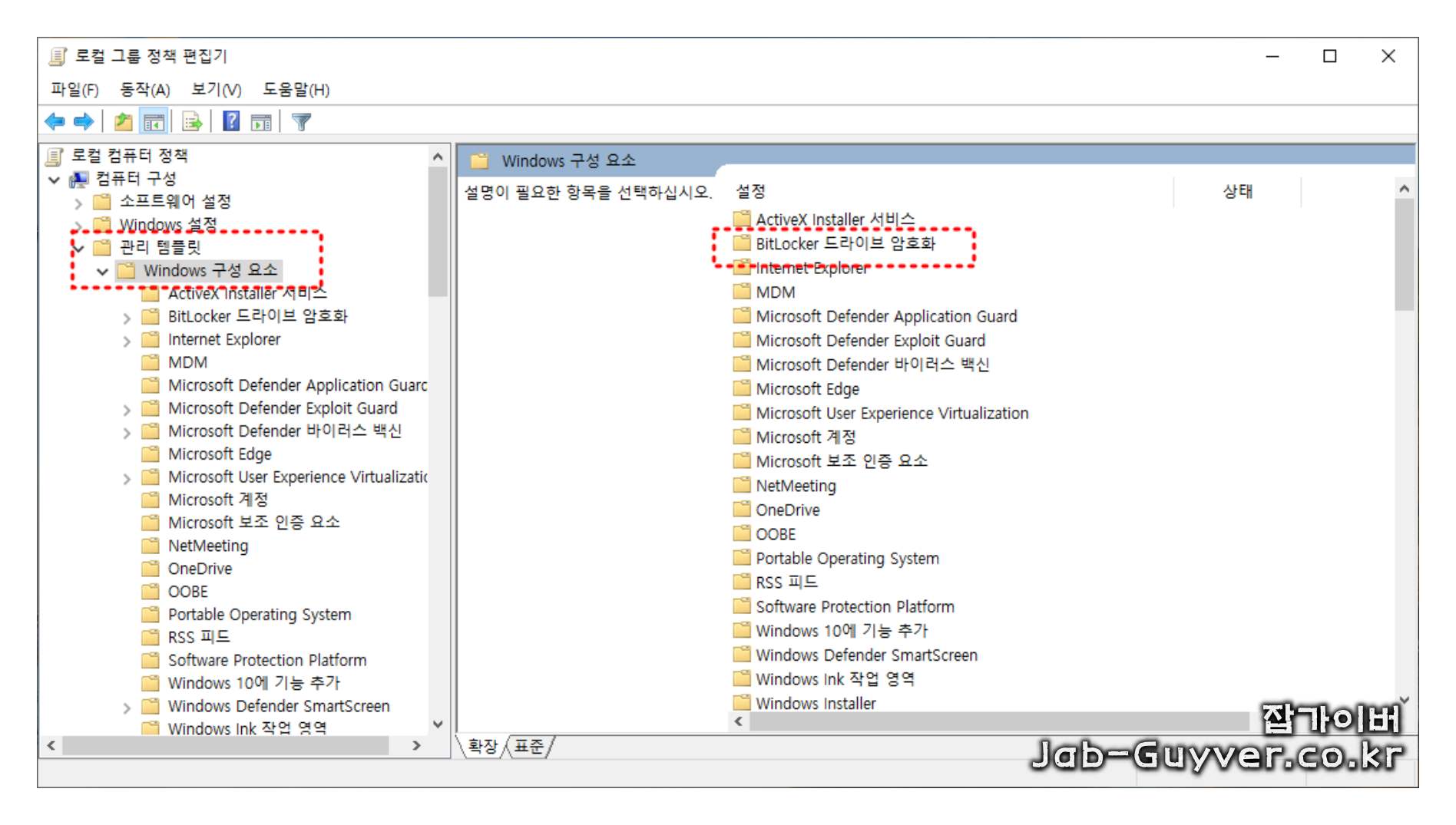 왼쪽 트리에서 로컬 컴퓨터 정책 > 컴퓨터 구성 > 관리 템플릿을 펼치고, 아래에서 Windows 구성 요소를 찾는다.