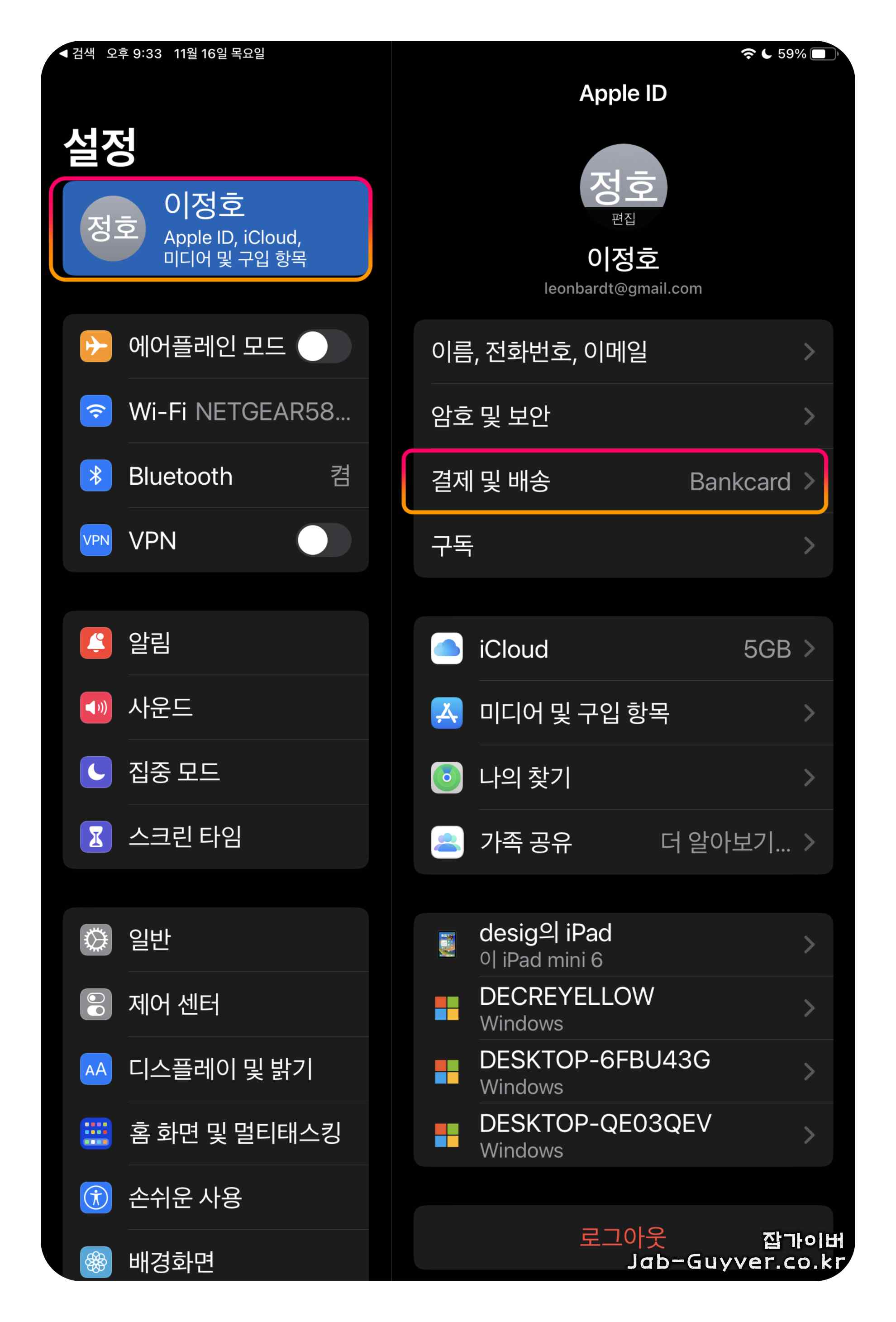 아이패드에서 바로 설정하려면 홈 화면에서 설정 앱을 열고, 상단에 표시된 Apple ID 이름을 눌러 들어간 다음 미디어 및 구입을 선택합니다. 여기에서 결제 및 배송 메뉴를 누르면 이 계정과 연결된 모든 결제수단을 확인할 수 있습니다.