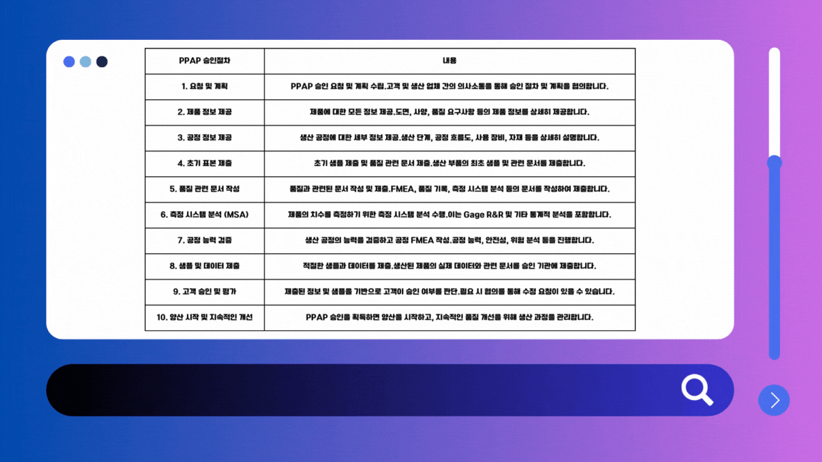 총론적으로 PPAP은 효과적인 품질 관리를 위한 중요한 단계로, 생산 부품의 승인 절차를 체계적으로 진행하여 생산 이후의 품질 문제를 방지하는 역할을 합니다.