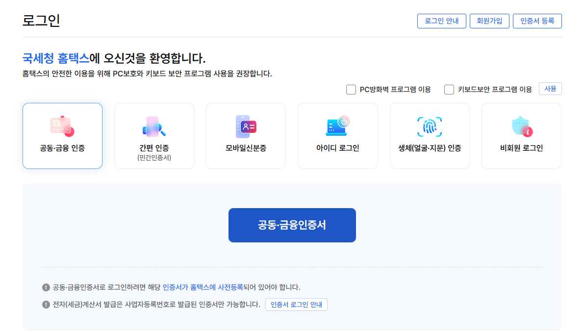 - 공동인증서 사용 시 IE 또는 전용 로그인 프로그램 권장