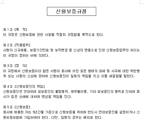 제1조【목적】이 규정은 신원보증에 관한 사항을 적절히 규정함을 목적으로 한다.제2조【적용범위】사원의 신규채용, 보증기간만료 및 보직변경 등 신상의 변동으로 인한 신원보증업무의 처리는 이 규정이 정하는 바에 의한다.제3조【정의】이 규정에서 신원보증이라 함은 사원이 회사에 끼친 모든 형태의 피해 및 사규에 대한 위반행위 또는 사원의 신상에 관하여 신원보증인이 일체의 책임을 지고 이를 해결함을 말한다.제4조【신원보증인의 책임】신원보증인은 연대하여 피보증인의 불법행위, 채무불이행, 기타 피보증인의 행위로 인하여 회사가 입은 손해에 대하여 변상할 책임을 진다.제5조【신원보증】회사에 채용된 자는 5년간을 기준으로 신원보증을 위하여 반드시 연대보증인을 설정하거나 신원보증보험에 가입하여야 한다. 다만, 임원의 경우는 예외로 한다.제6조【연대보증】사원은 2인의 연대보증인을 설정하여야 한다.제7조【신원보증계약의 성립과 기간】① 신원보증계약은 신원보증인이 신원보증서상에 인감을 날인함으로써 성립한다.② 신원보증기간은 5년으로 하며 기간만료의 경우에는 10일 전에 보증인을 경신하여야 한다. 제8조【신원보증인의 자격】① 신원보증인은 순수재산세 연 30,000원 이상의 재산능력을 갖추어야 한다. 단, 피보증인의 부모 및 주민등록상의 동거인은 보증인이 될 수 없다.② 신원보증인은 신용과 덕망이 있는 자로서 다음 각호에 해당하지 않아야 한다.