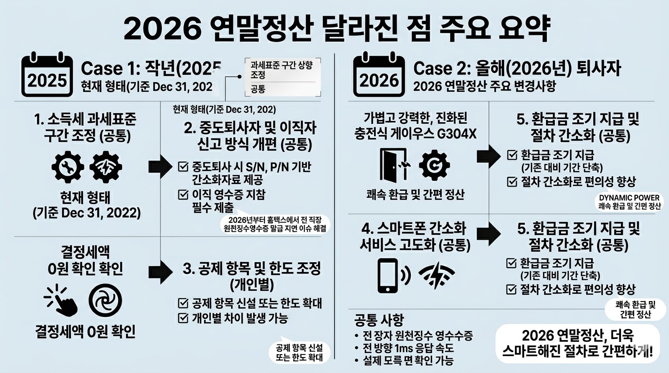 특히 해마다 공제 항목이 조금씩 달라지고 홈택스 화면도 바뀌다 보니, 예전 글만 보고 그대로 따라가면 숫자부터 일정까지 어긋나는 경우가 많습니다. 이번 글에서는 2025년 귀속분을 2026년에 정산하는 기준으로 바뀐 내용과 함께, 이직자·중도 퇴사자·휴직자가 실제로 무엇을 챙겨야 하는지 자연스럽게 정리해보겠습니다.