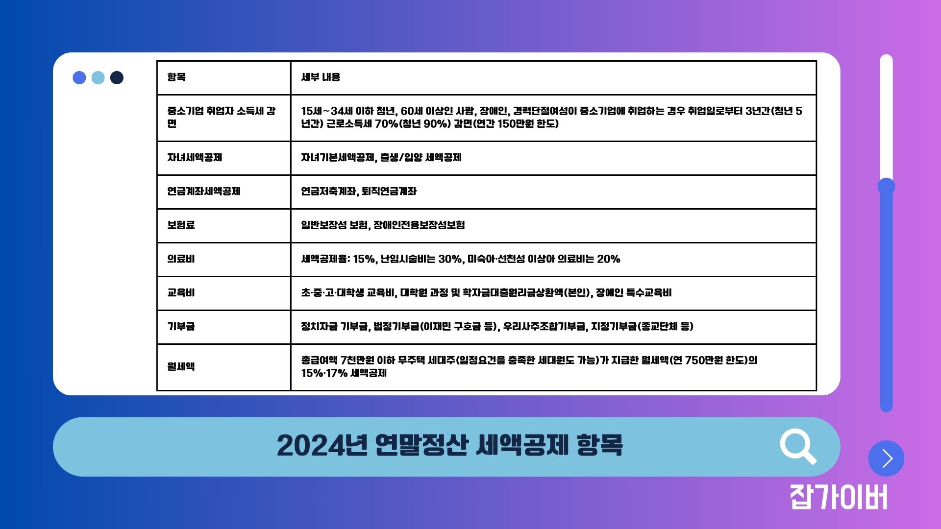 | 소득공제 | 세금을 매기기 전 과세 대상 소득을 줄여주는 항목입니다. 신용카드, 인적공제, 주택자금 공제 등이 여기에 들어갑니다. |
