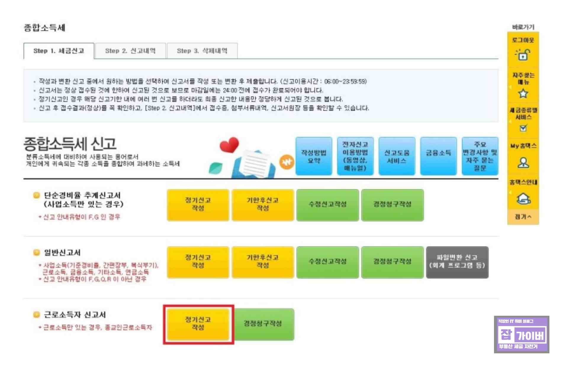 | 종합소득세 신고 | 5월 정기신고 메뉴 | 중도 퇴사자, 누락 공제, 다른 소득 합산이 필요한 경우 직접 신고합니다. |