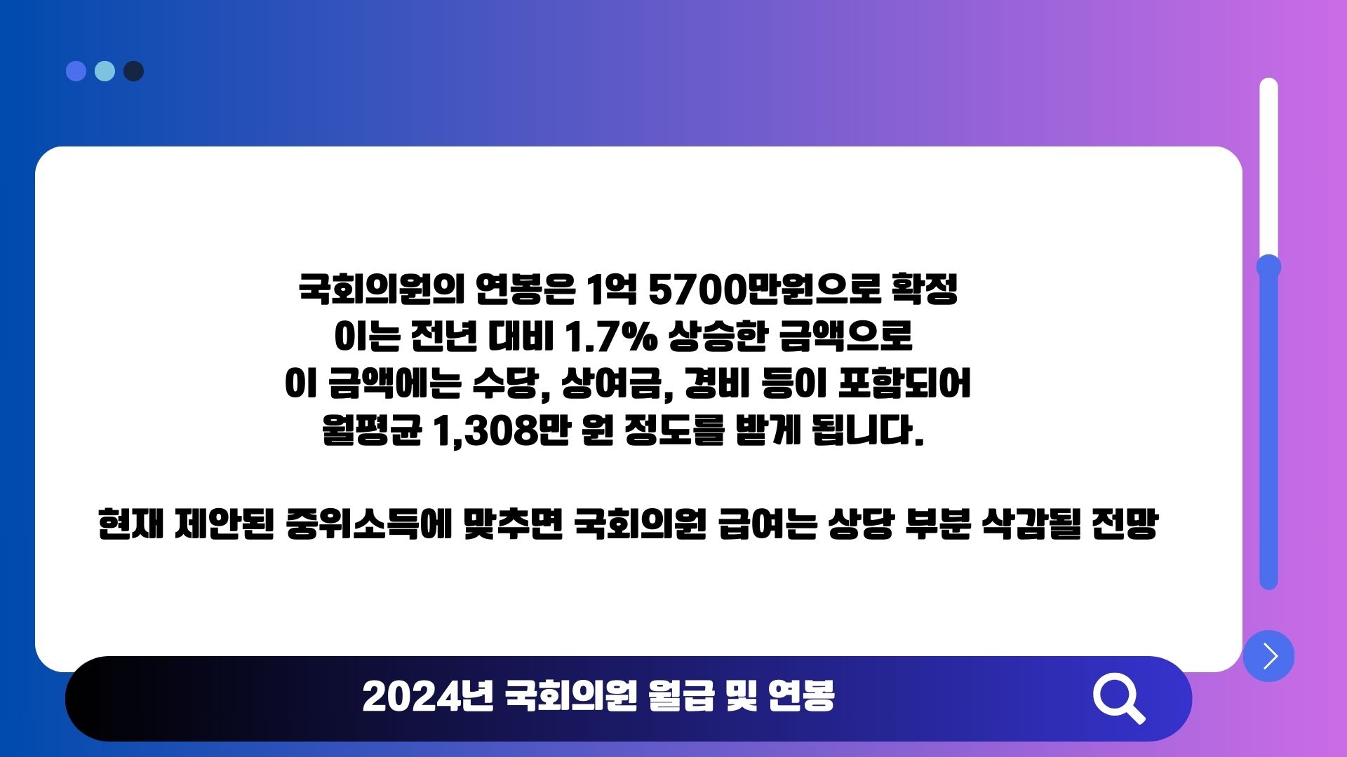 2024년 기준 국회의원의 연봉은 약 1억 5,700만원, 월 평균으로 보면 약 1,308만원입니다.