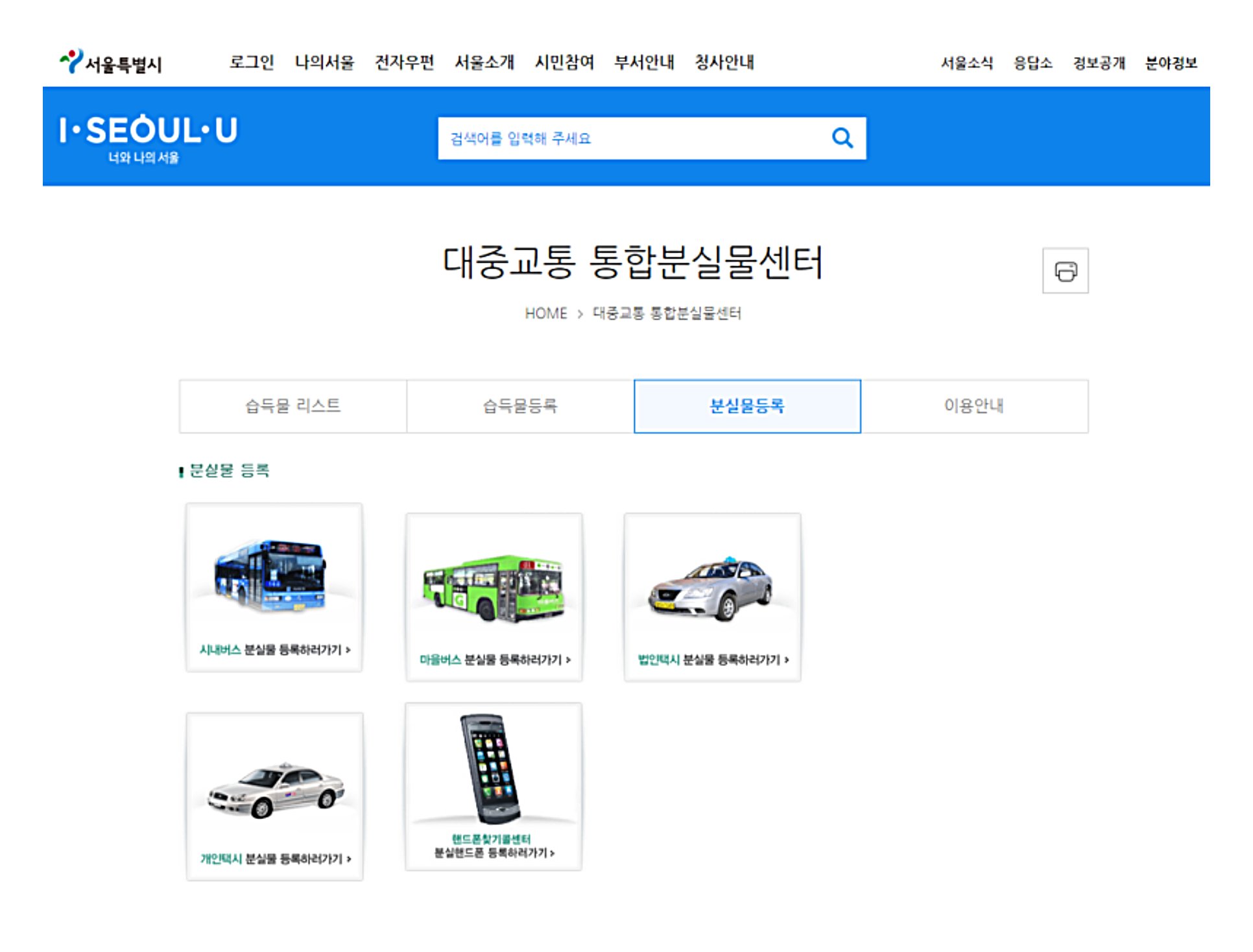| - | 대중교통 통합분실센터 (서울시 운영) http:/www.seoul.go.kr/v2007/find.html |