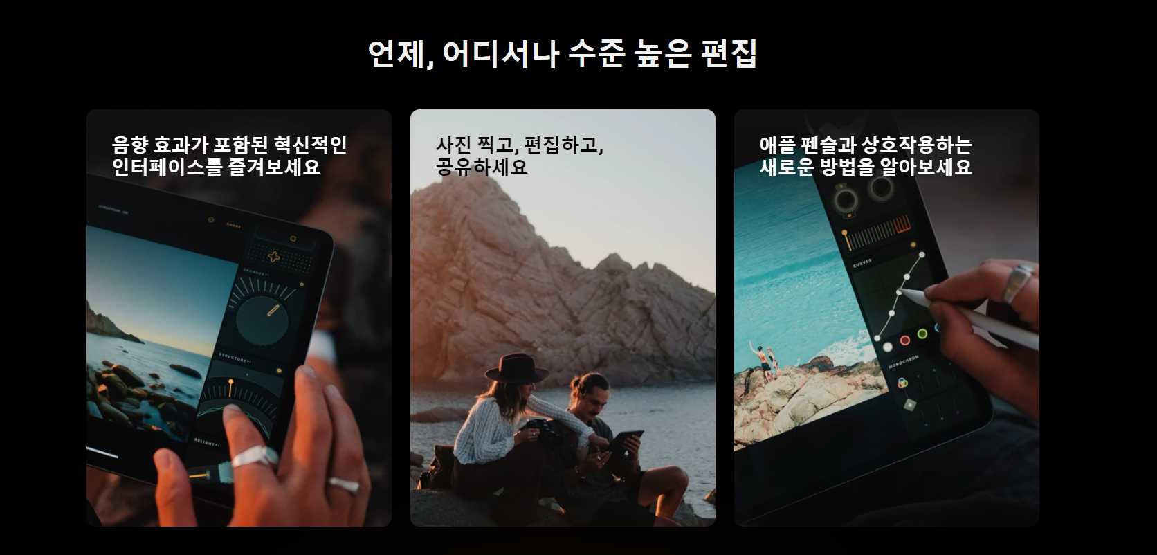 아이패드용 루미나르는 이동 중에도 사진 보정을 즐길 수 있게 해주는 편리함을 선사합니다.