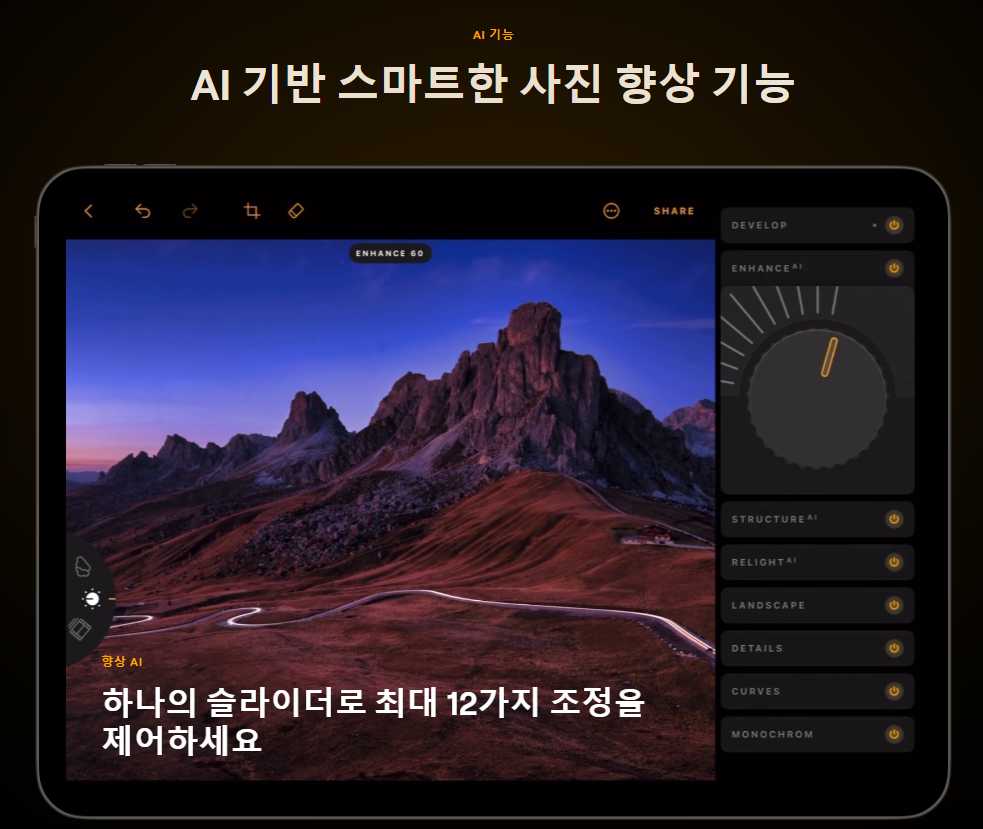 루미나르는 기존 데스크톱 버전에서 AI 인물보정, 하늘 교체, 풍경 보정으로 이미 유명한 프로그램인데, 이 느낌을 최대한 살린 채로 터치 기반 인터페이스에 맞게 잘 옮겨 놓은 게 특징입니다.