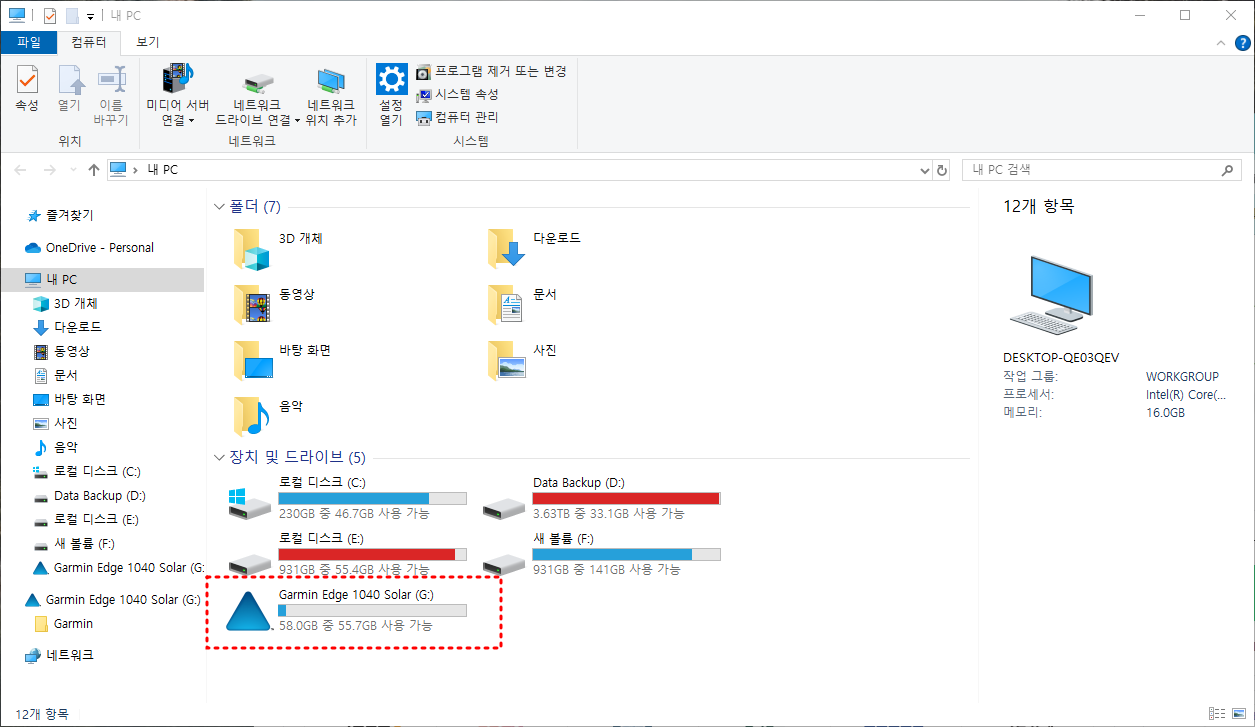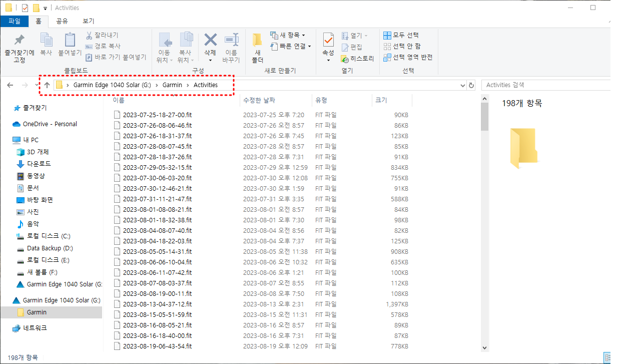 가민 엣지 장치와 컴퓨터를 연결하여 파일 탐색기에서 'Garmin' > 'Activities' 폴더로 이동하여 .fit 파일을 찾아서 백업하는 방식으로 진행됩니다.