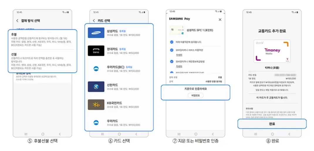 따라서 삼성페이를 사용하고자 한다면 카드 발급 시에 해당 사항을 확인하는 것이 좋으며 주요 메이저 카드사들은 대부분 모바일 후불 티머니를 지원하여 삼성페이 사용이 가능합니다.