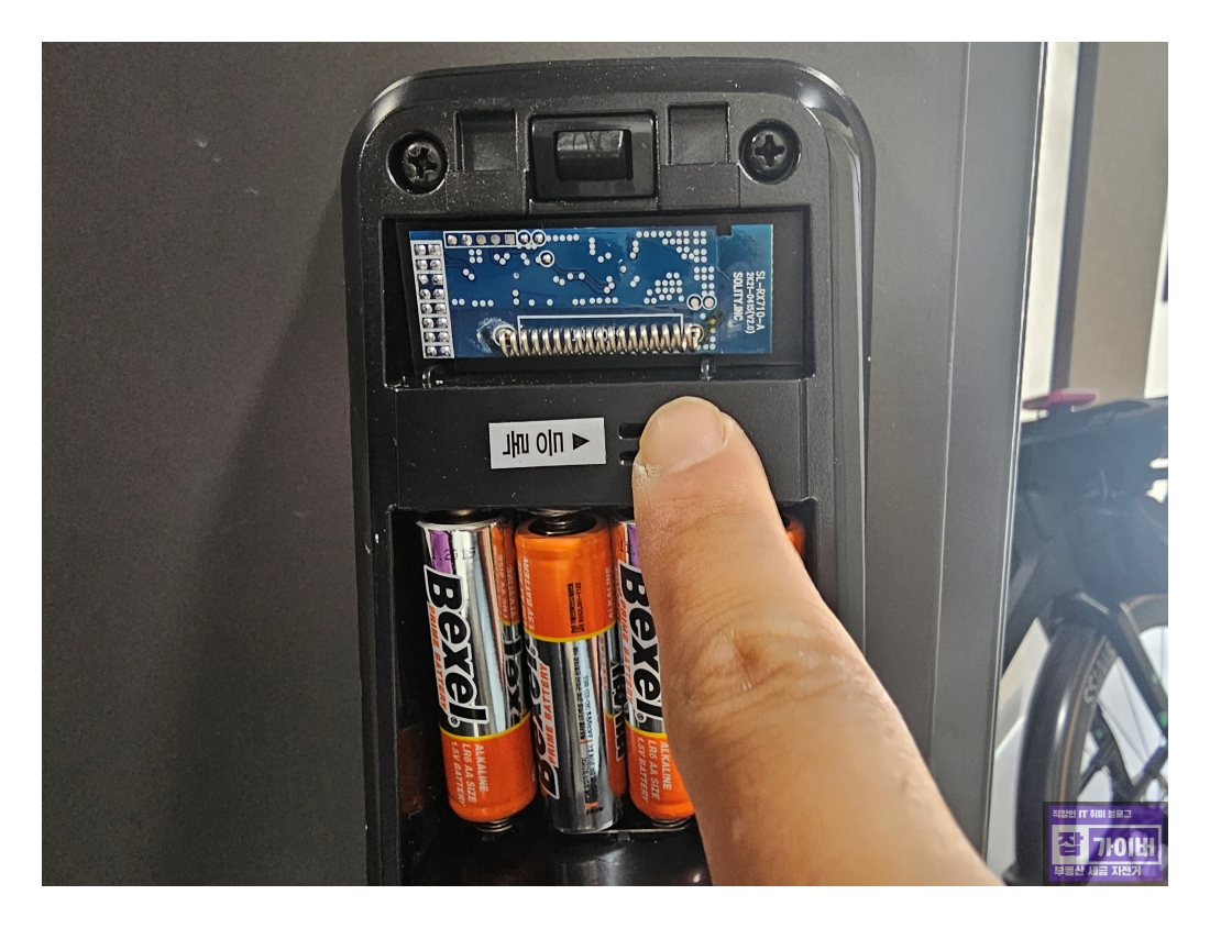 도어락 뒷면의 커버를 열고 “REG” 버튼 및 저의 경우 등록버튼이란 스티커가 붙어 있었는데 이걸 눌러줍니다.