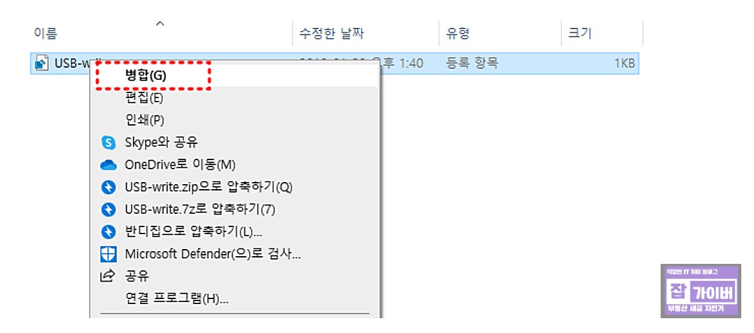 1. 다운로드 받은 USB-write.reg 파일을 마우스 오른쪽 버튼으로 클릭하고 '병합'을 선택합니다.