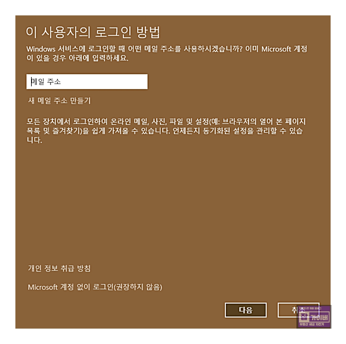 - 새 사용자 추가 창이 나타나면 Microsoft 계정을 사용하거나, "Microsoft 계정 없이 사용자 추가(Add a user without a Microsoft account)" 링크를 클릭하여 로컬 계정을 만듭니다.