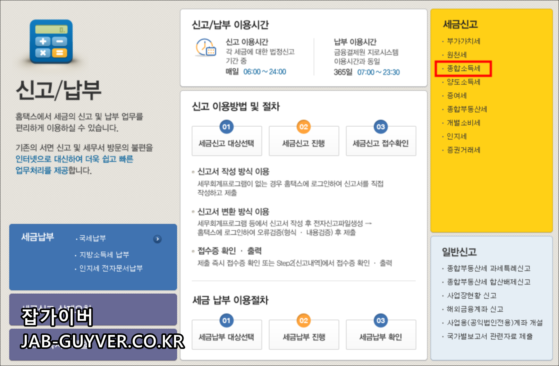 5월 신고 시즌에는 첫 화면에서 종합소득세 신고 메뉴가 바로 보이는 경우가 많습니다.
