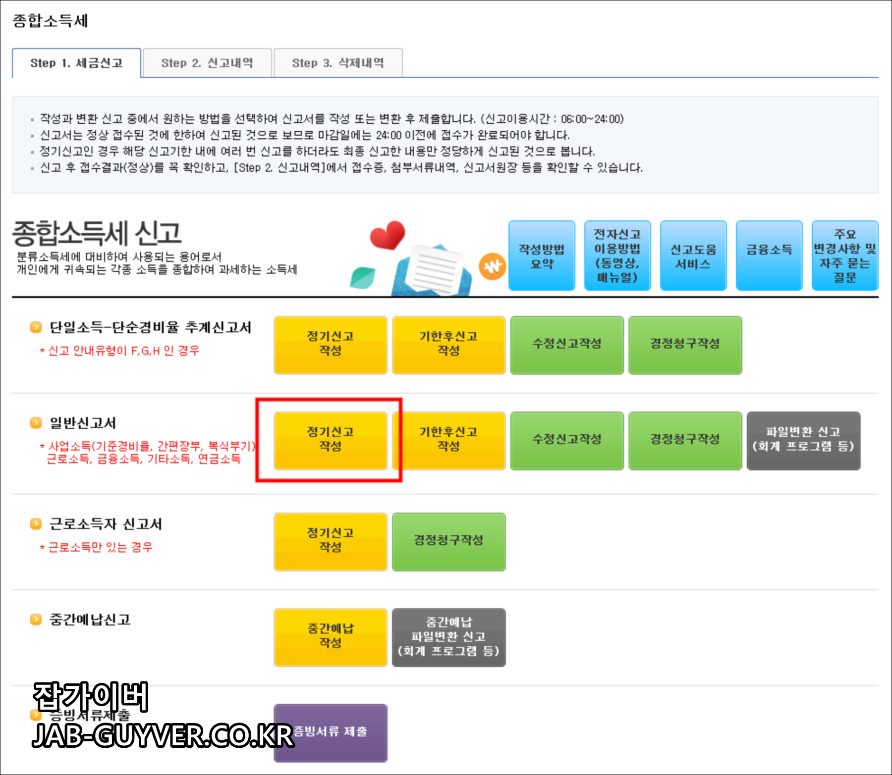 국세청이 안내하는 전자신고 경로도 세금신고 → 종합소득세 신고 → 정기신고 작성 순서로 설명하고 있습니다.