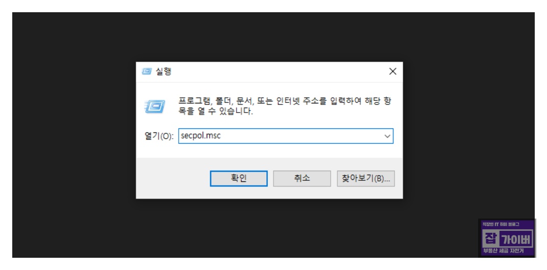 윈도우키 + R 키를 눌러 실행 창에 "secpol.msc"를 입력 후 엔터 키를 누릅니다.
