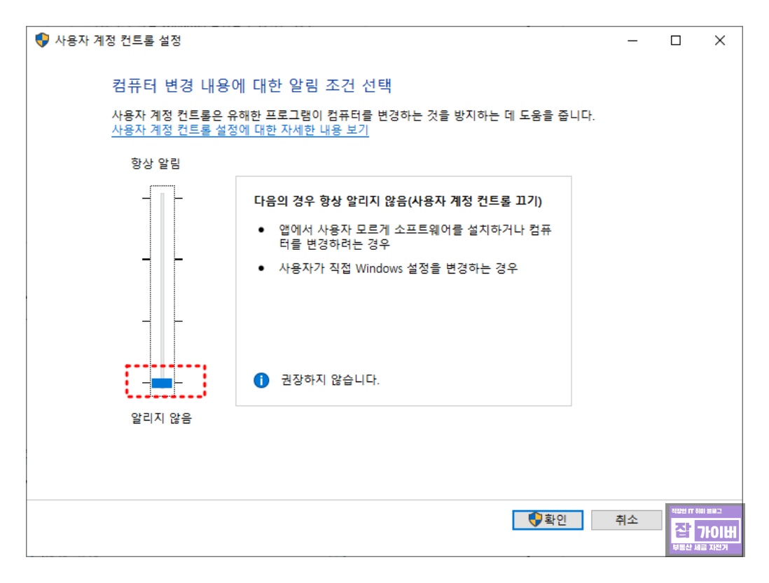 [사용자 계정 컨트롤 설정 변경]을 선택 후 사용자 계정 컨트롤 설정 창이 열리면 알림을 가장 아래로 이동하여 알림 비허용으로 체크한 다음 [확인] 버튼을 클릭합니다.