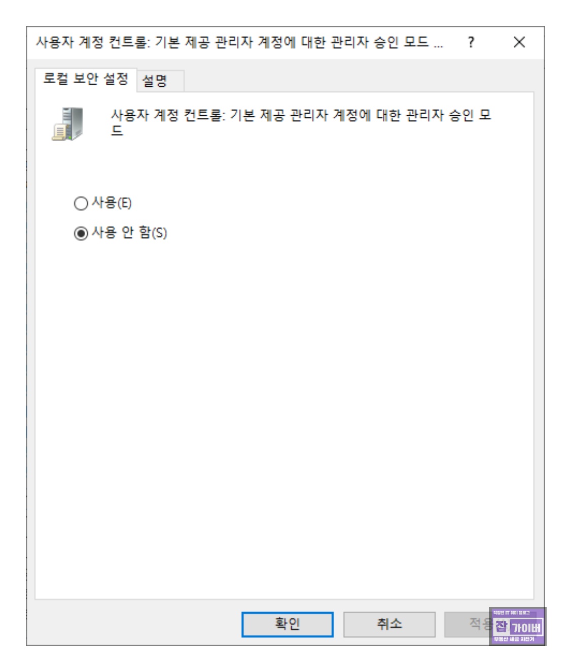 속성 창이 열리면 [사용]을 선택하고 [확인] 버튼을 클릭합니다.