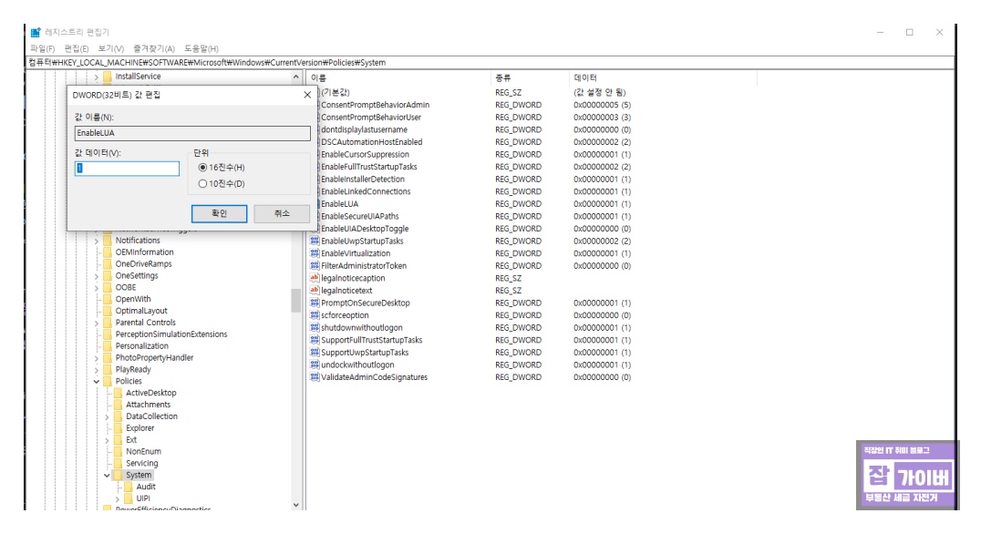 해당 폴더에서 [EnableLUA]를 더블클릭 후 값 편집 창이 열리면 값을 "1"로 입력합니다.