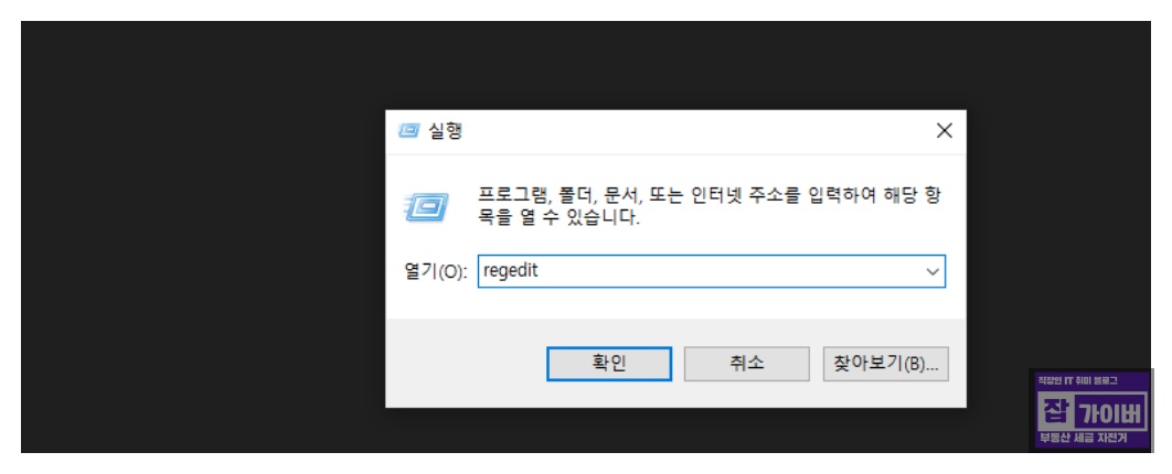 윈도우키 + R 키를 눌러 실행 창에 "regedit"를 입력 후 엔터 키를 누릅니다.