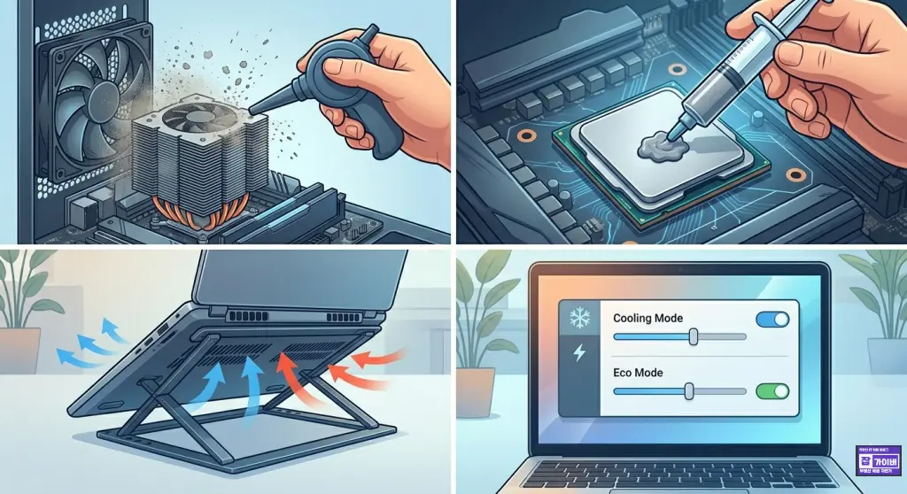 바닥 통풍 확보 → 작업 관리자 확인 → 시작프로그램 정리 → 먼지 상태 점검 → 쿨링패드나 거치대 보강 → 서멀 상태 확인입니다. 처음부터 분해를 고민하기보다 쉬운 부분부터 확인하는 편이 훨씬 효율적입니다.